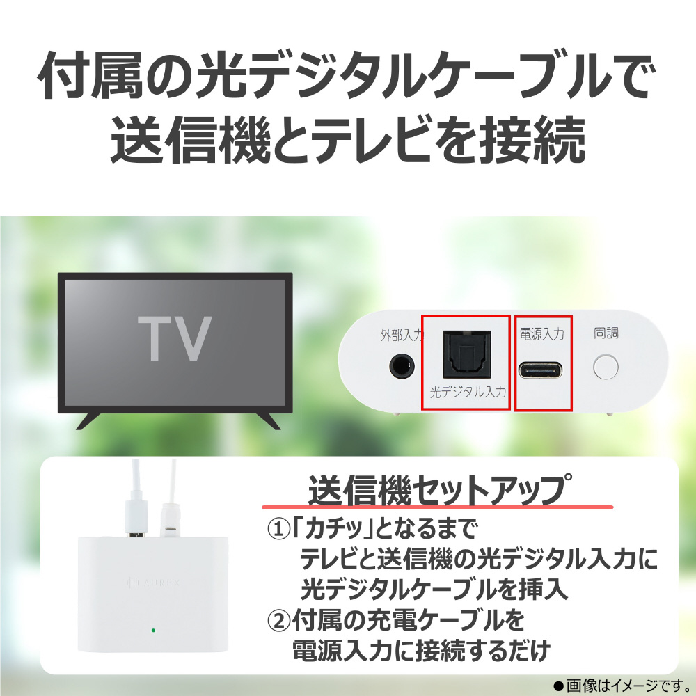 付属の「光デジタルケーブル」で、送信機側とテレビ側の光デジタル端子に接続するだけ。