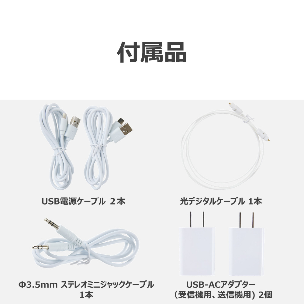 | 付属品 | USB-ACアダプター(受信機用、送信機用)2個、USB電源ケーブル(約1.5m)2本、光デジタルケーブル(約1.5m)1本、Φ3.5mm ステレオミニジャックケーブル(約1m)1本、保証書付取扱説明書 |