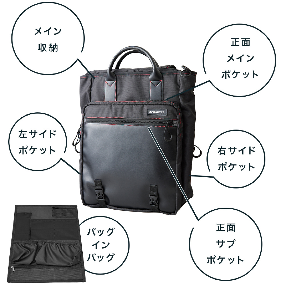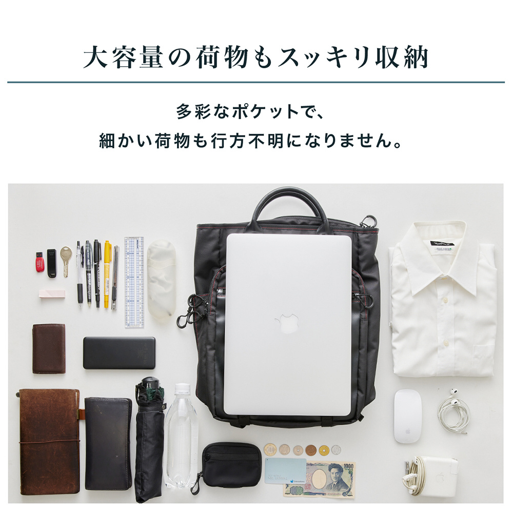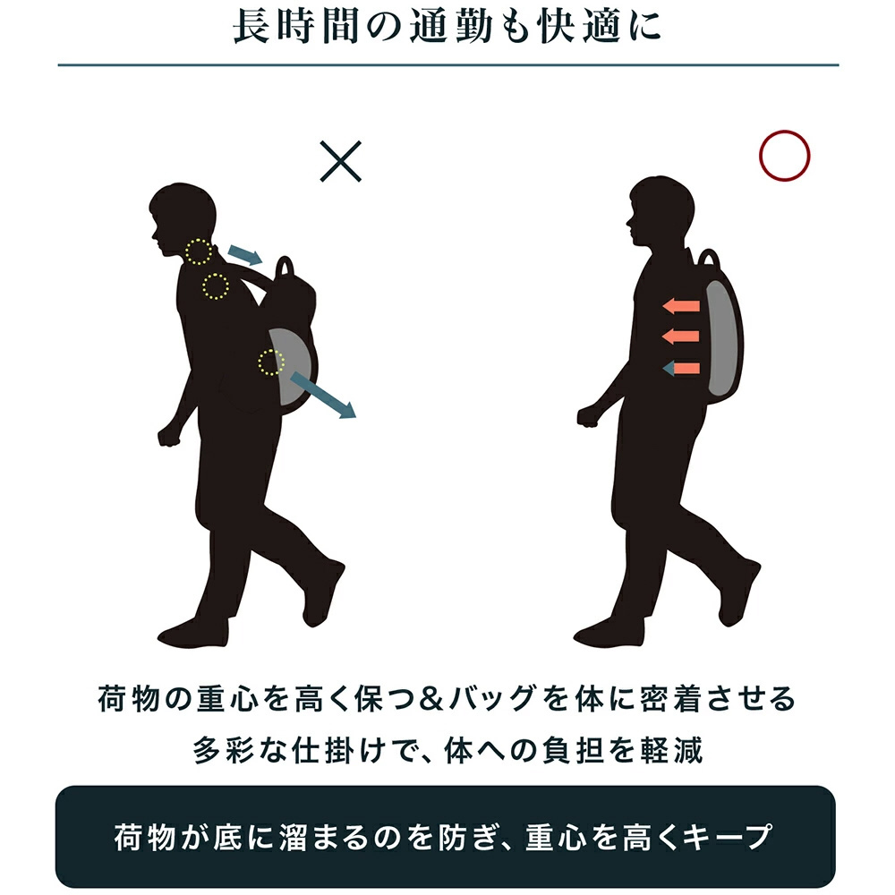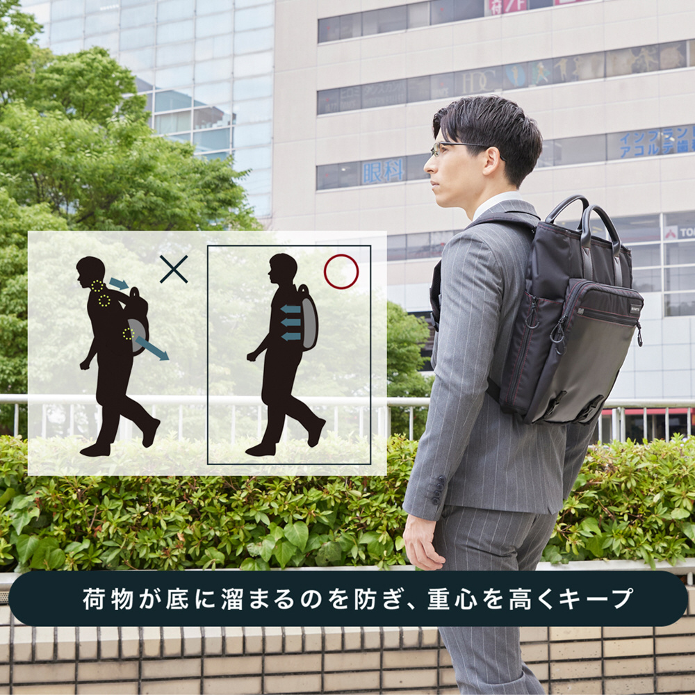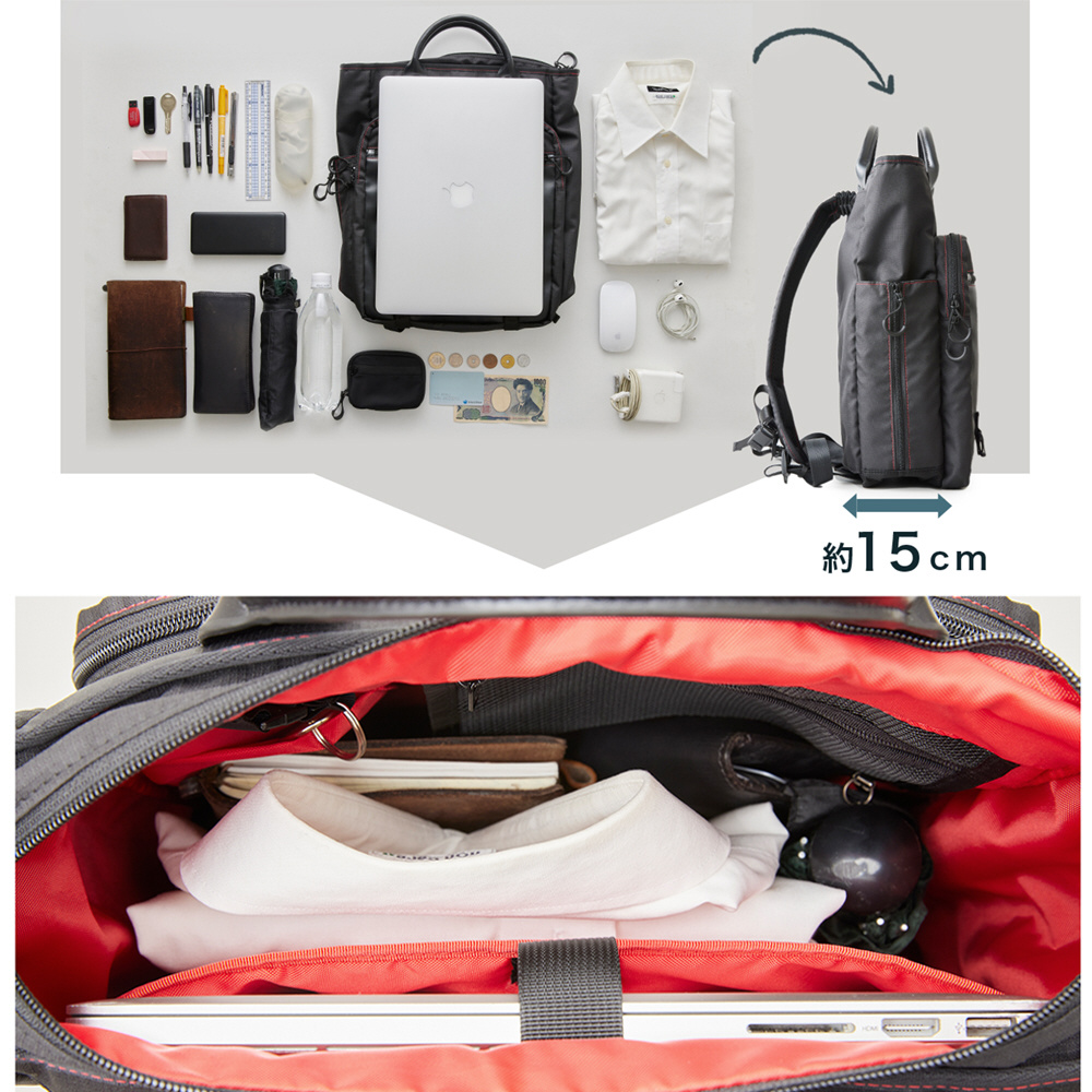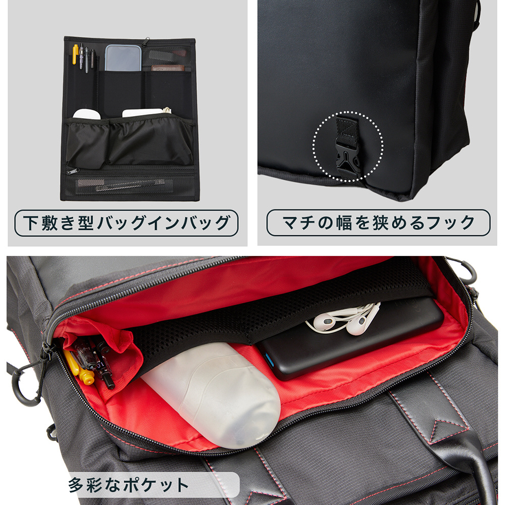 下敷き型バッグインバッグとマチの幅を狭めるフックで荷物が底に溜まるのを防ぎ、重心を高くキープする事ができます