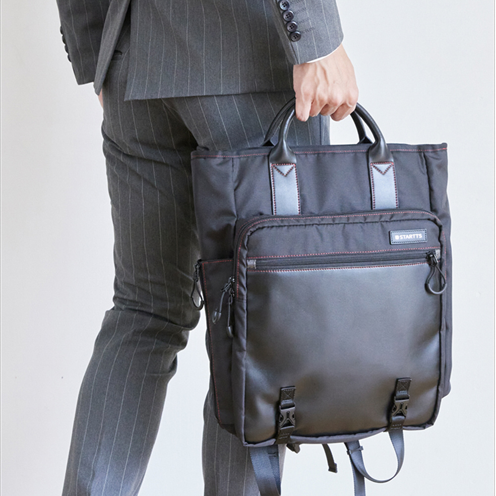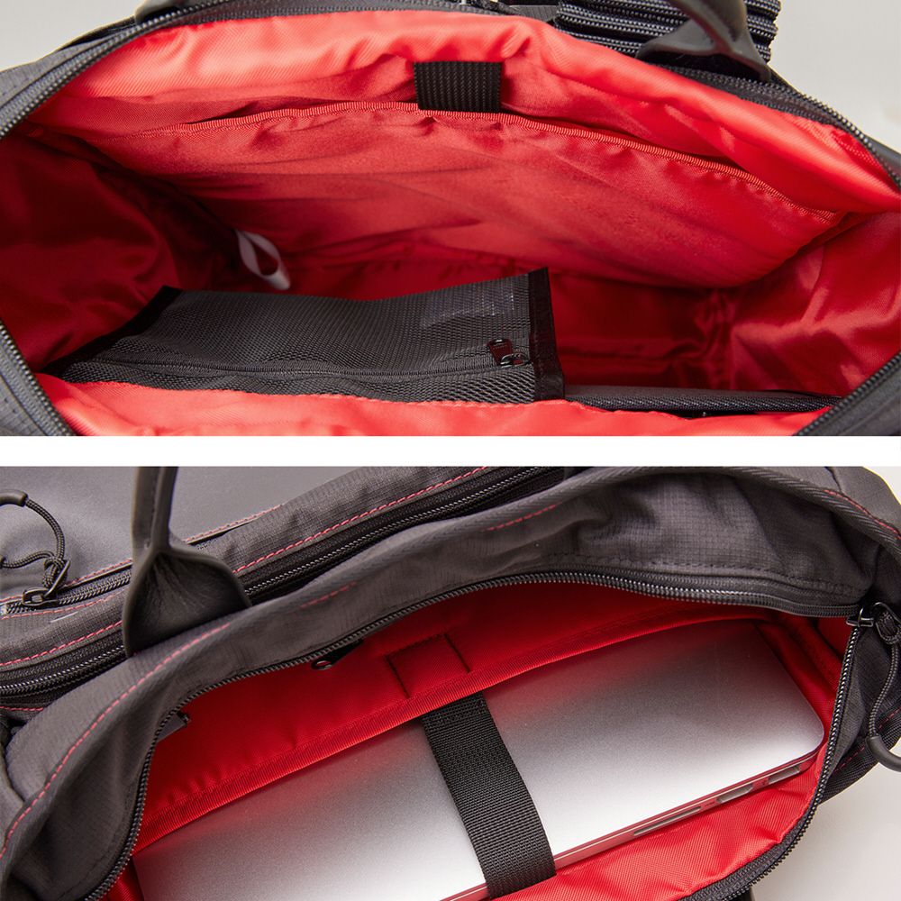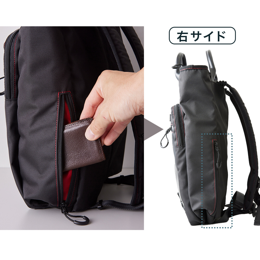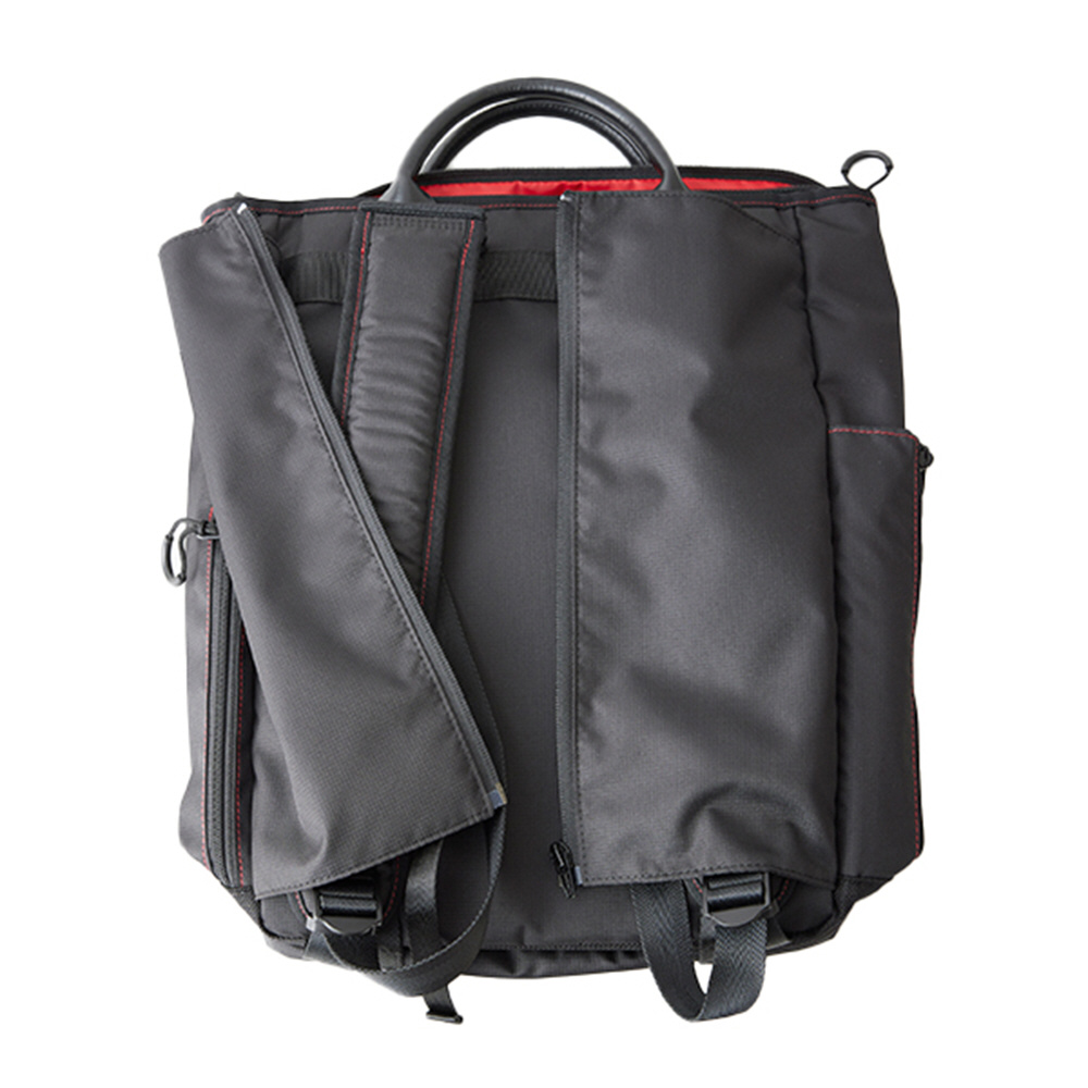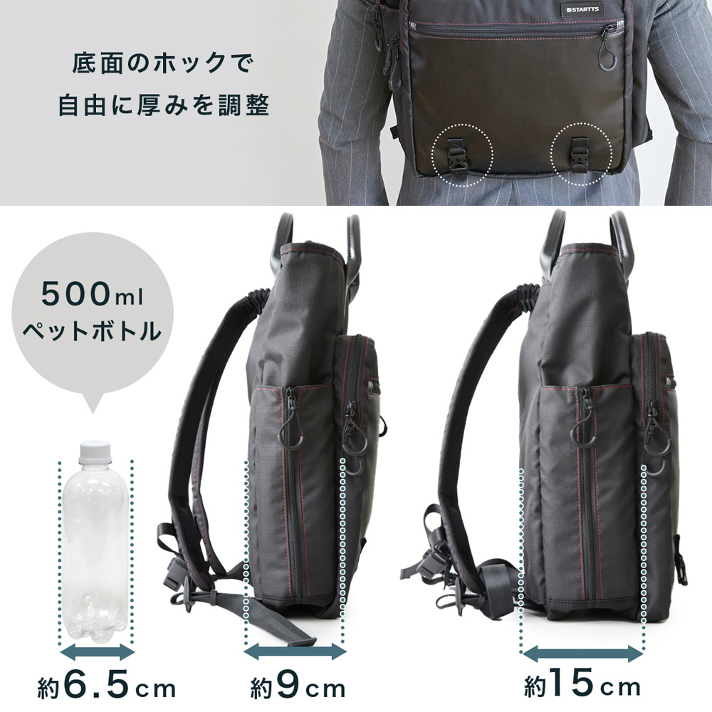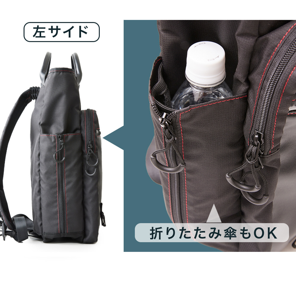 下敷き型バッグインバッグとマチの幅を狭めるフックで荷物が底に溜まるのを防ぎ、重心を高くキープする事ができます
