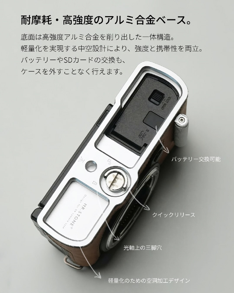 ケースを取り付けた状態で、バッテリー、SDスロットへアクセスできます。