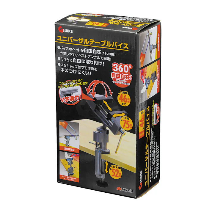 ●バイスのヘッドが自由自在(360°回転)作業しやすいアングルで固定 ●工作台に自由に取り付け ●ゴムキャップ付で工作物をキズつけにくい ●ゴムキャップを外すとパイプなどもしっかり固定 V字溝付
