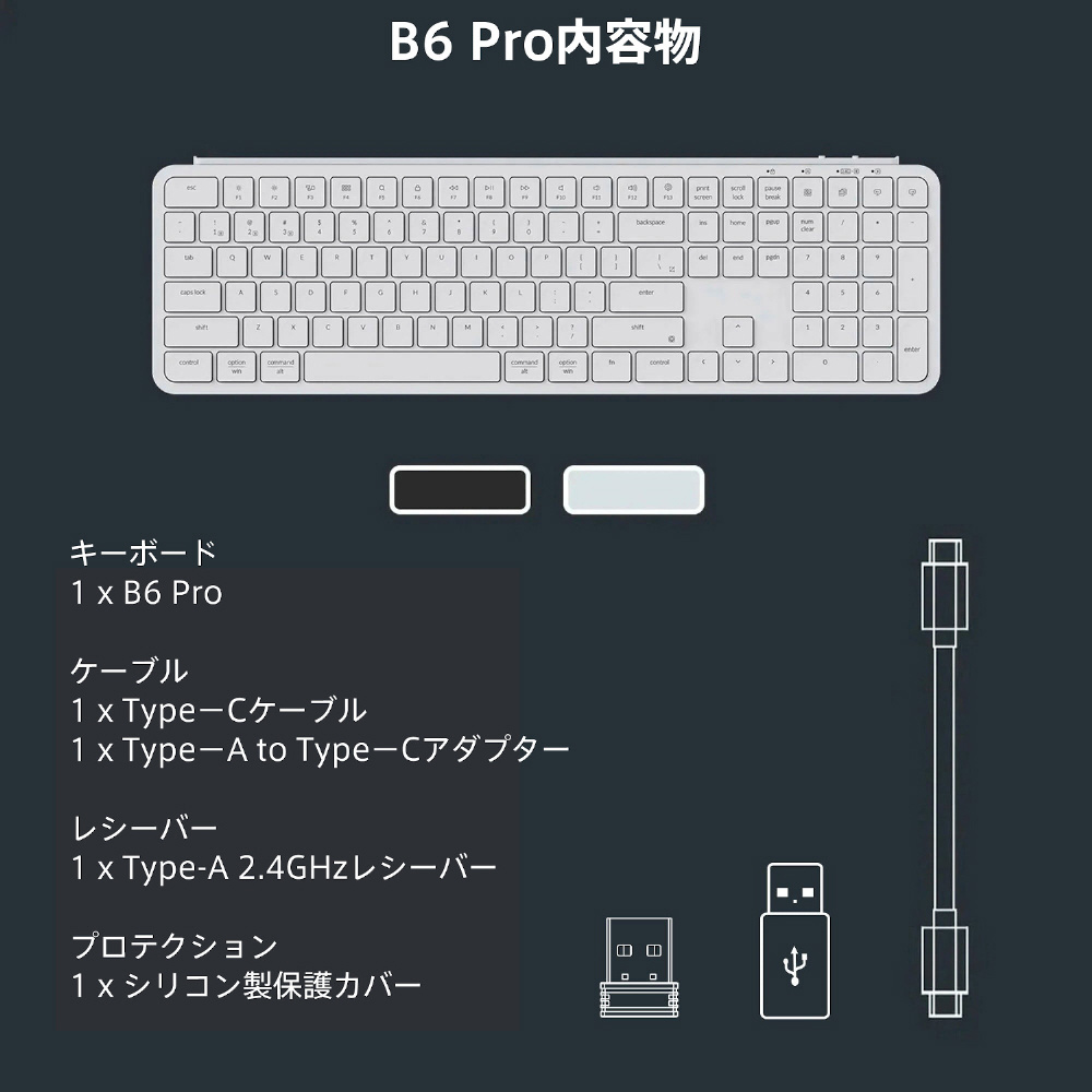 付属品 Type-Cケーブル x1、USB-A to USB Type-Cアダプター x1、レシーバー用アダプターx 1、Type-A 2.4GHzレシーバーx 1、ユーザーマニュアルx1