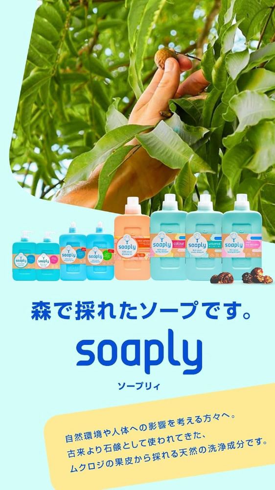 オランダ生まれのエコ洗剤“soaply(ソープリー)”は、2017年 石油由来成分の代替えとして使用できるソープナッツ(ムクロジ)をほぼメイン成分とした