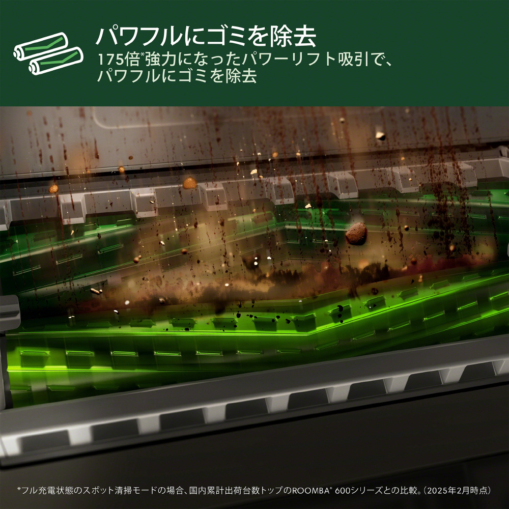 ※フル充電の状態のスポット清掃モードの場合、国内累計出荷台数トップのRoomba600シリーズとの比較。(2025年2月時点)