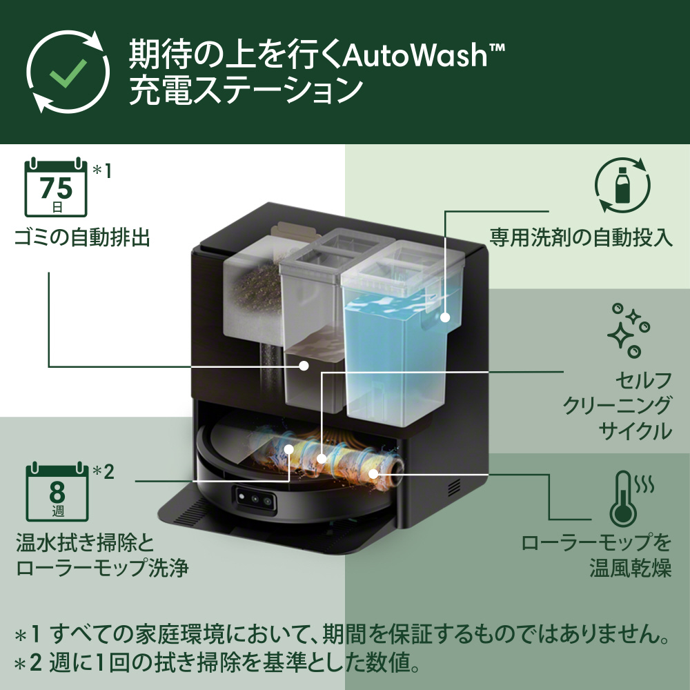 | 付属品 | ロボット本体、バッテリー(内蔵)、AutoWash 充電ステーション(紙パック装着済み+交換用紙パックx1)、電源コード、交換用デュアルエッジクリーニングブラシx1セット、交換用フィルターx1、洗剤サンプル(30ml)、お手入れツール |