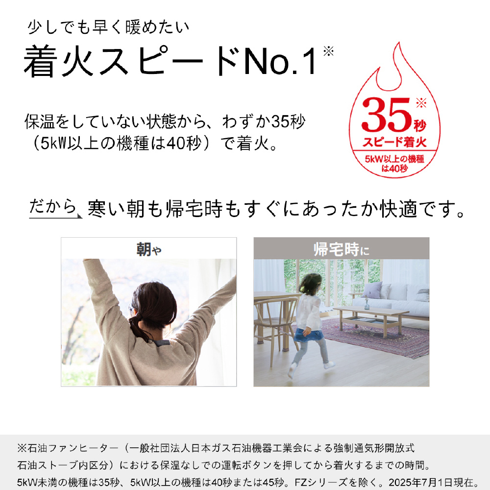 保温をしていない状態から、わずか35秒で着火。冷え切ったお部屋をすばやく暖めます。