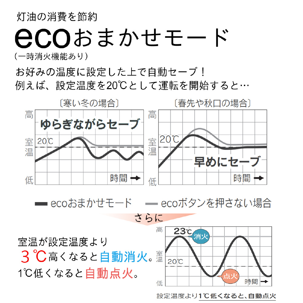 設定温度プラス3℃で自動消火、マイナス1℃で自動点火。快適温度を保ちながら灯油の消費を上手に節約します。