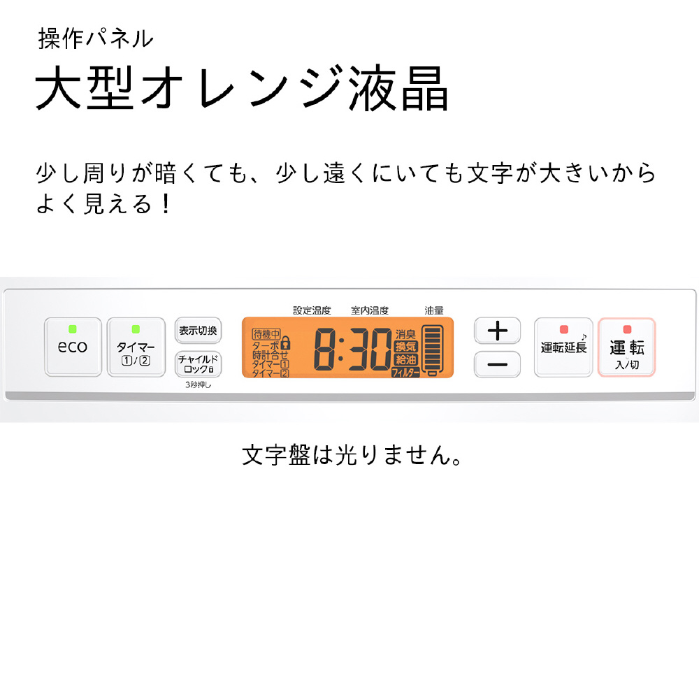 安全機能 | 不完全燃焼防止装置、対震自動消火装置、停電安全装置、過熱防止装置、燃焼制御装置、点火安全装置、消し忘れ消火装置、気密油タンクの給油時消火装置、室温異常高温防止装置 |