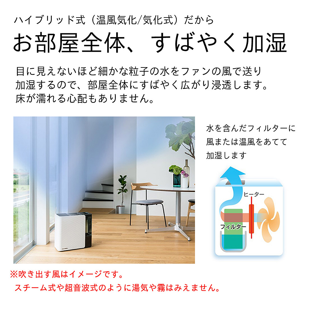 ダイニチの加湿器は湿度に応じて自動で運転方式を切り換えるハイブリッド式。