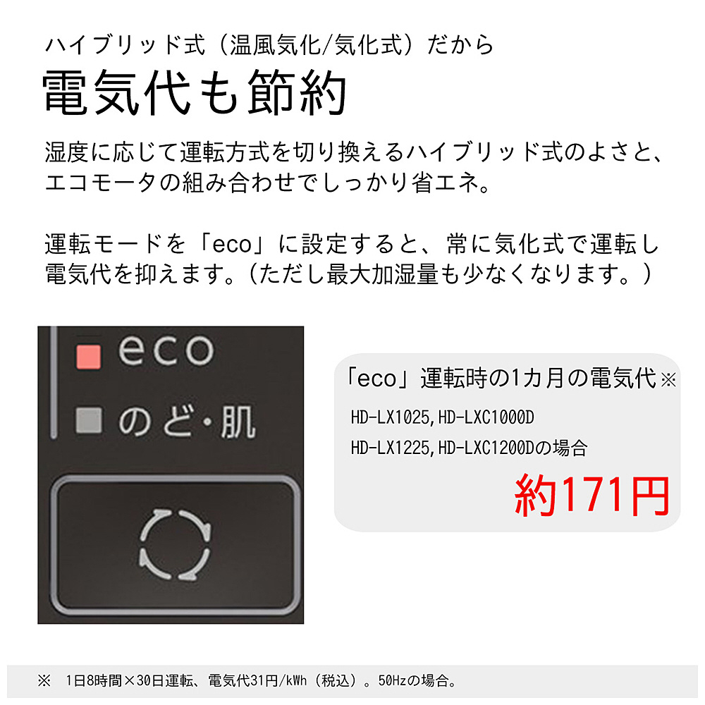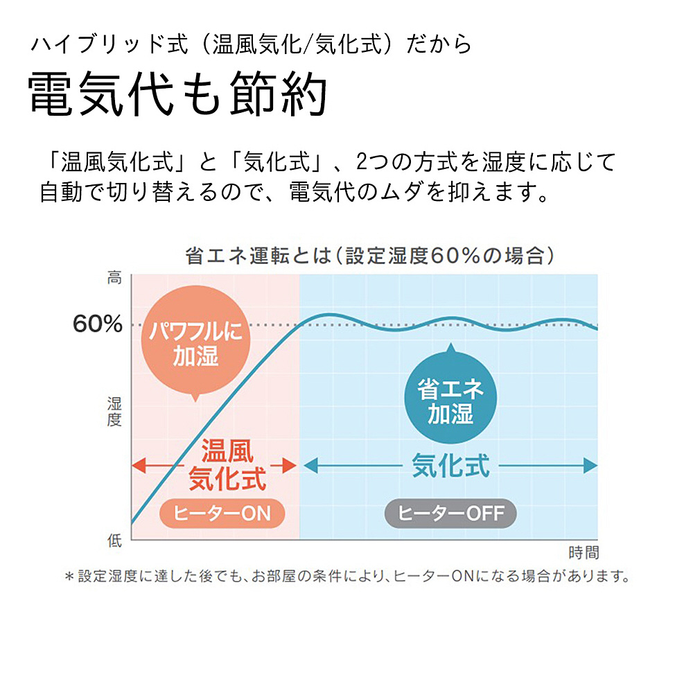 「eco」運転モードに設定すると、常時ヒーターレスの気化式で運転するので、電気代をさらに節約。