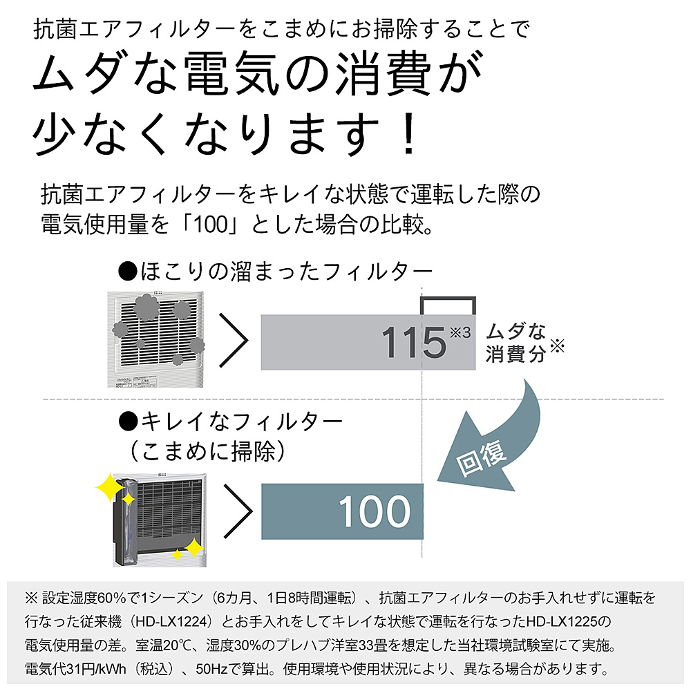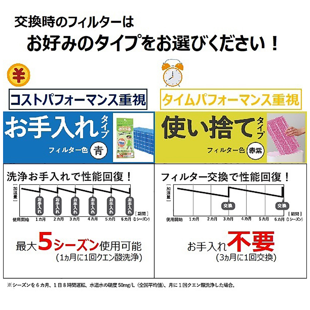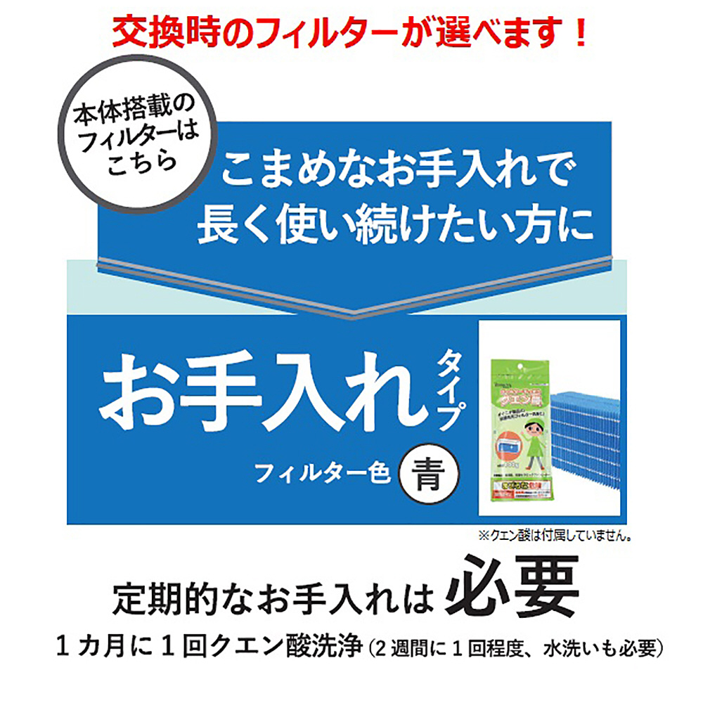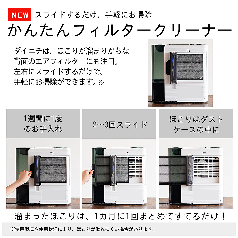 かんたんフィルタークリーナーならフィルターをスライドするだけでほこりが取れるからお手入れがとってもかんたん。楽にお掃除できて快適に加湿。