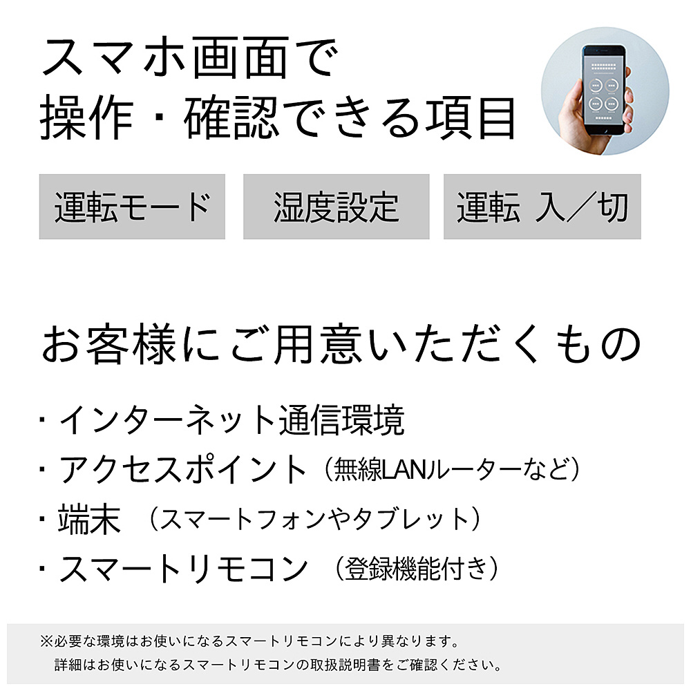 市販のスマートリモコンを使用することで、家の中でも外出先でも、スマホやタブレットなどから操作することができます。