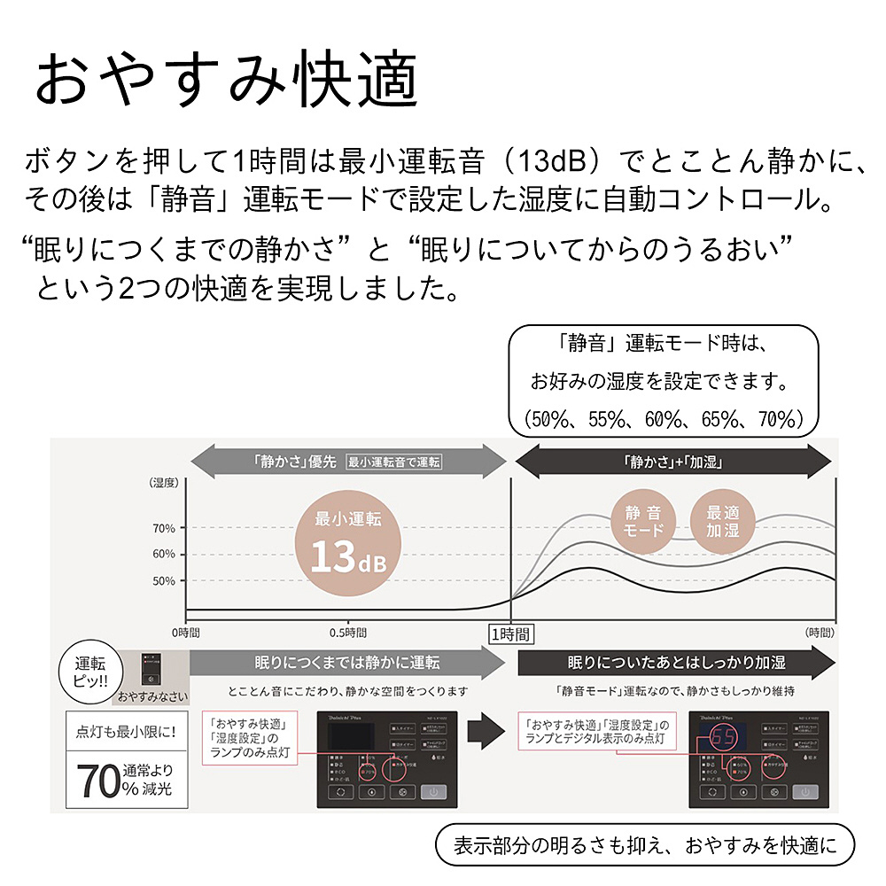 約1時間は13dBでとことん静かに運転。その後は「静音」運転モードで、設定した湿度に自動でコントロール。