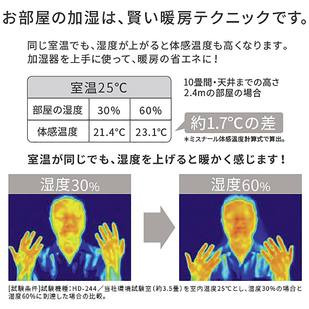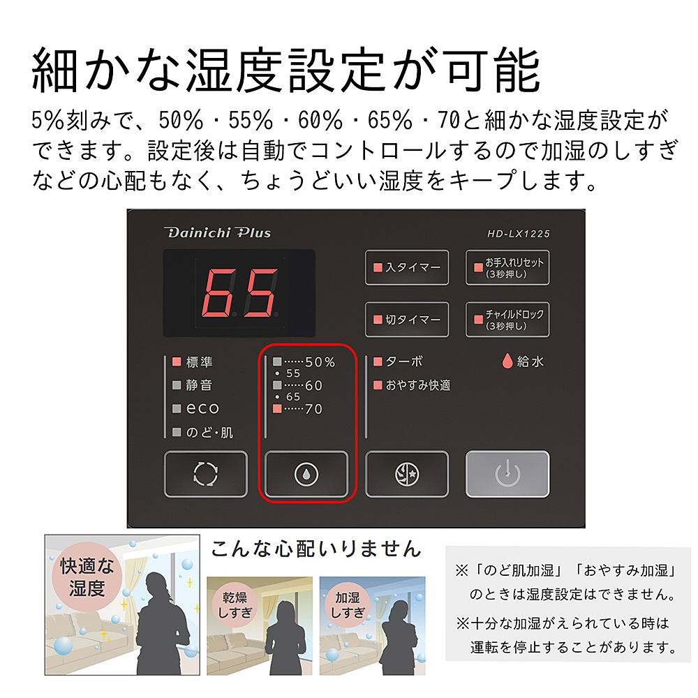 50・55・60・65・70%の5段階で湿度設定が可能。設定した湿度に合わせて自動で加湿量を調整しながら運転します。