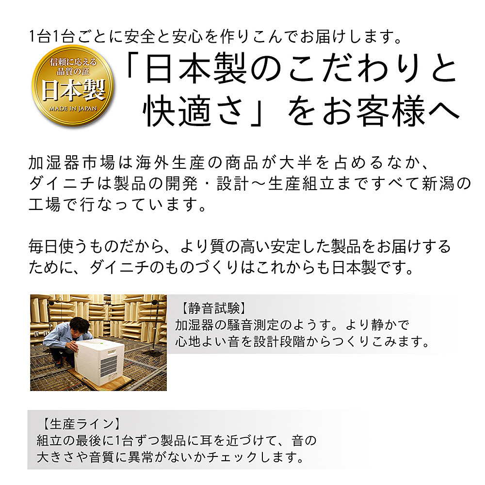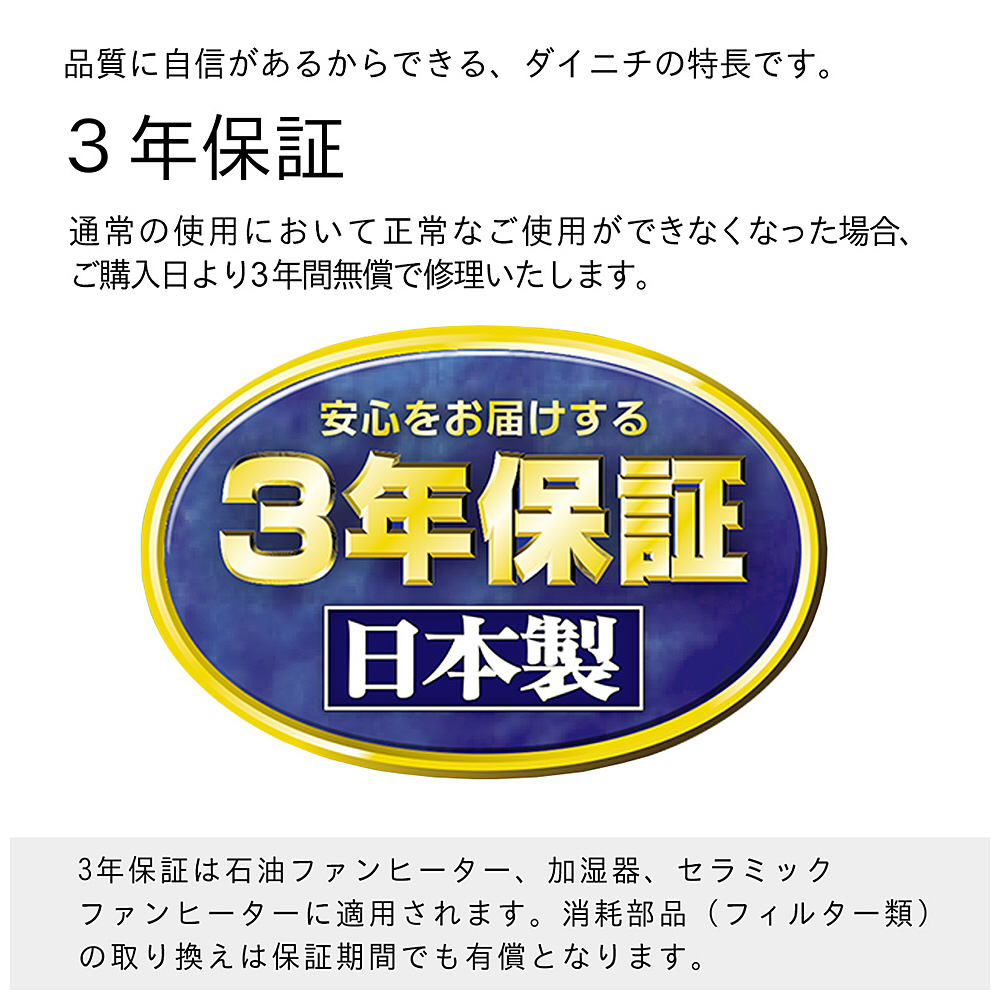 標準運転時最大34dB、最小13dB。ダイニチはこだわりの技術で業界トップクラスの静かさを実現。