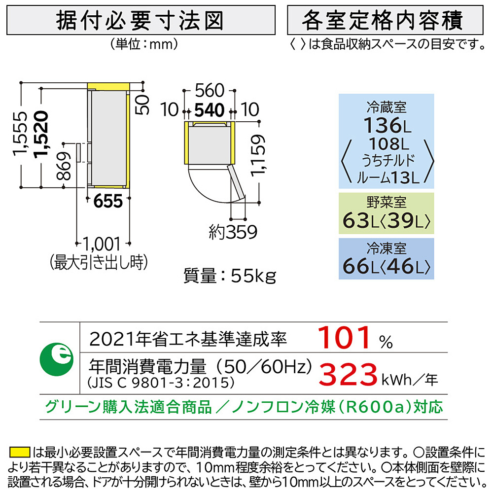 | 年間消費電力量 | 323kWh/年(JIS C 9801-3:2015) |