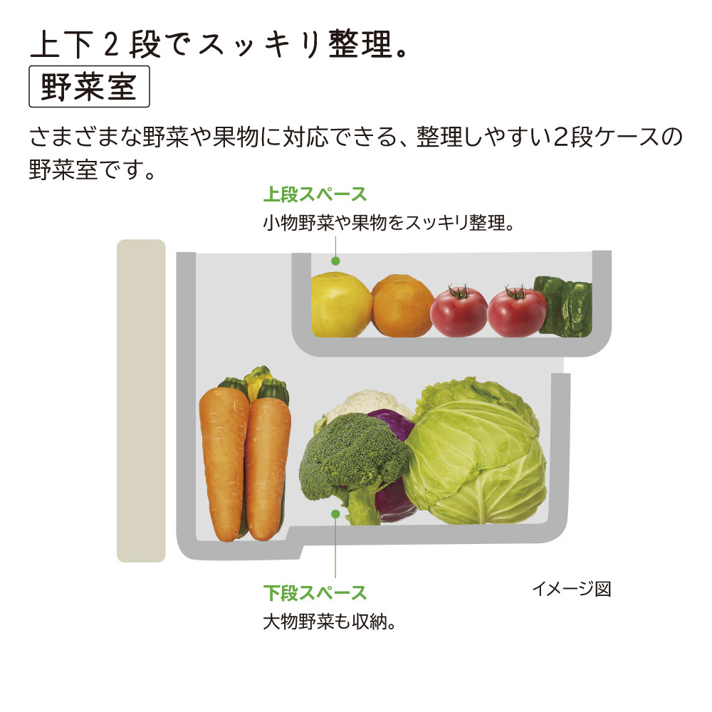 シンプルデザインのスリム幅54cm「まんなか野菜」。「チルドルーム」採用3ドアタイプ。手動製氷(「どこでもアイスセット」つき)。