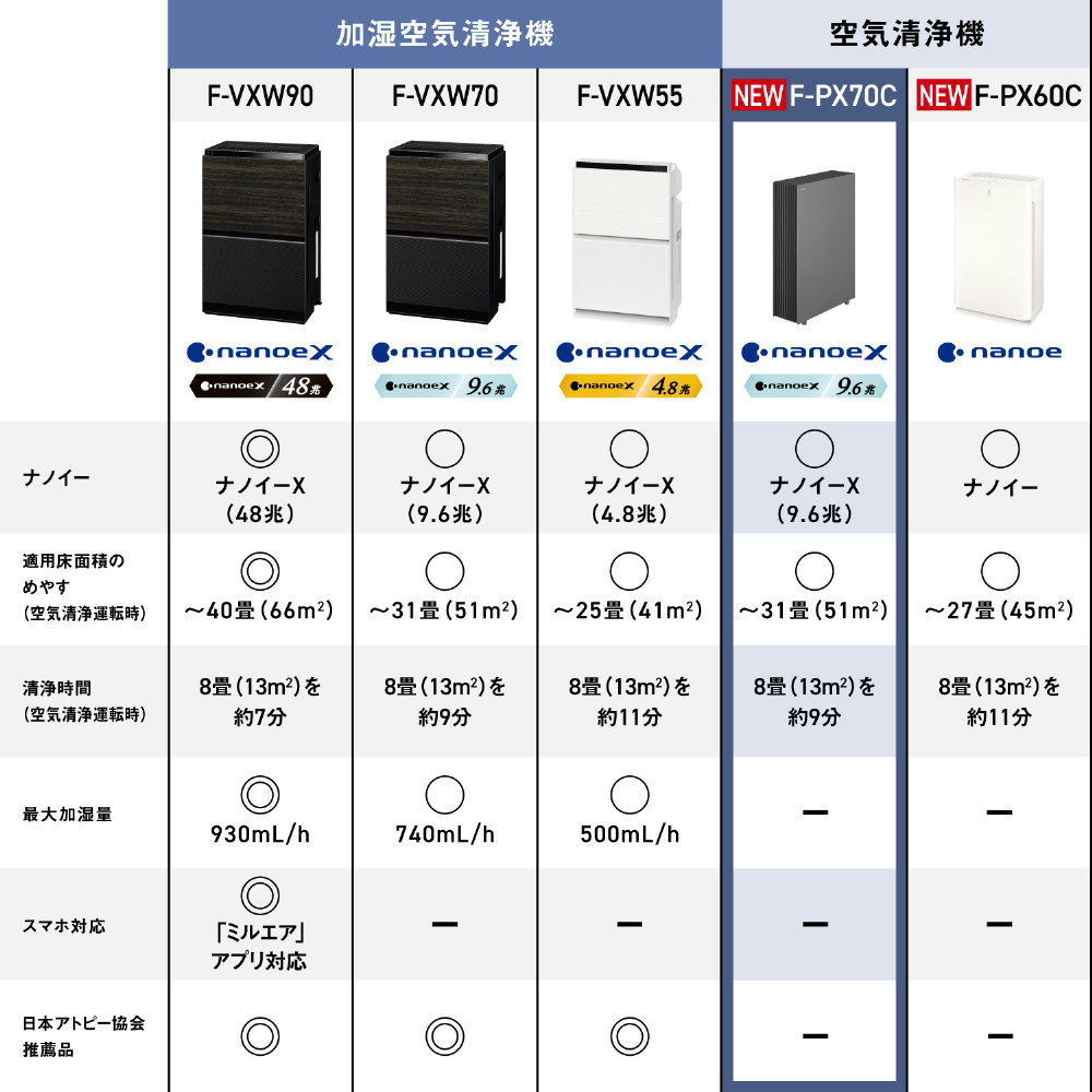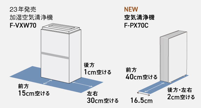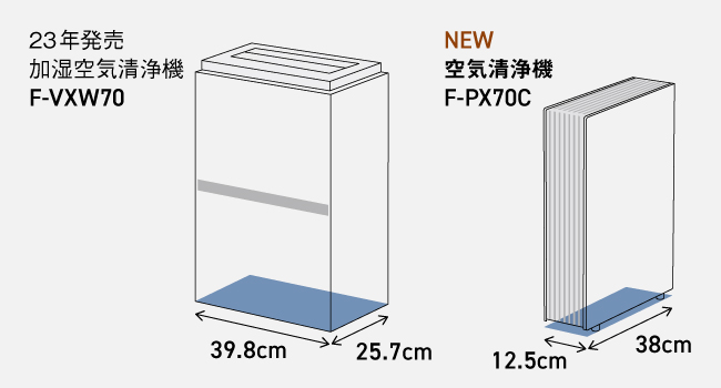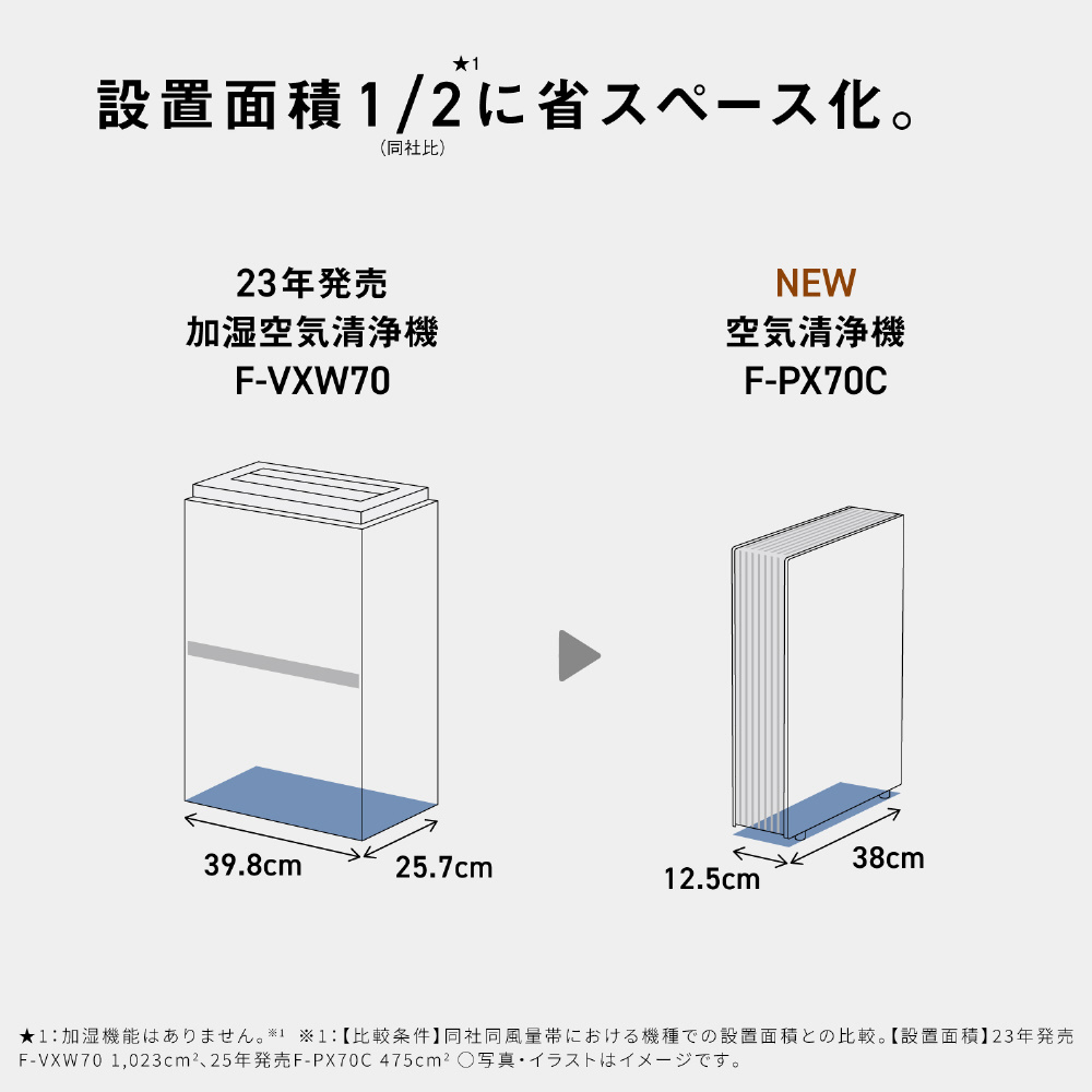 ※1 【比較条件】同社同風量帯における機種での設置面積との比較。【設置面積】23年発売F-VXW70 1,023cm2、25年発売F-PX70C 475cm2