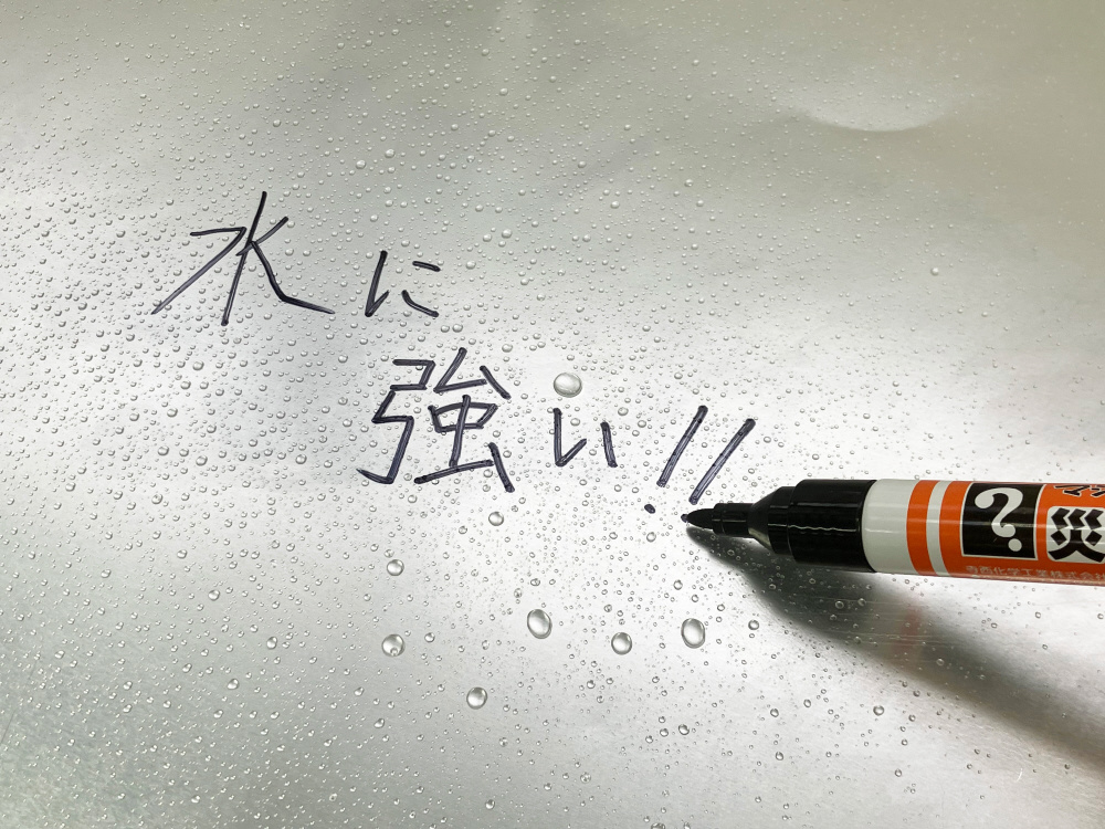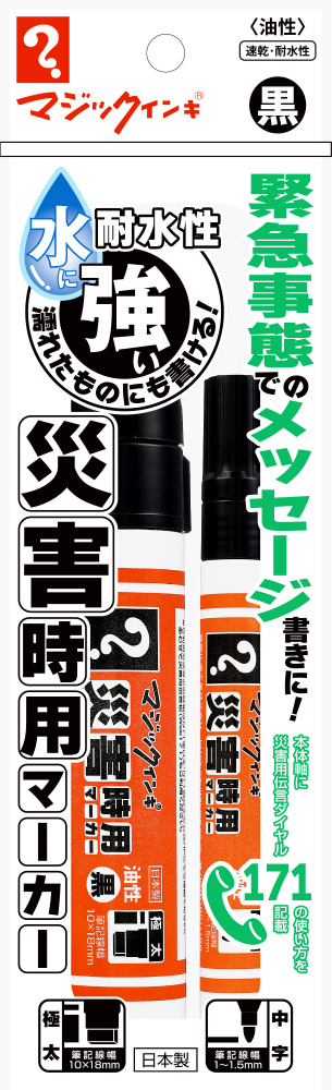 マジックインキ 災害時用マーカー 極太・中字 黒 2本パックは、緊急時の心強い味方!油性マーカーは「災害時に欲しかったものに上げられるアイテム」ですが、「災害時用マーカー」は雨・水に強いインキを採用しており、濡れたものに書けるので緊急時に大活躍します。避難所での連絡メモや支援物資への記載、家族への伝言記入などに最適です。本体軸に、災害用伝言ダイヤル(171)の使い方を記載しております。