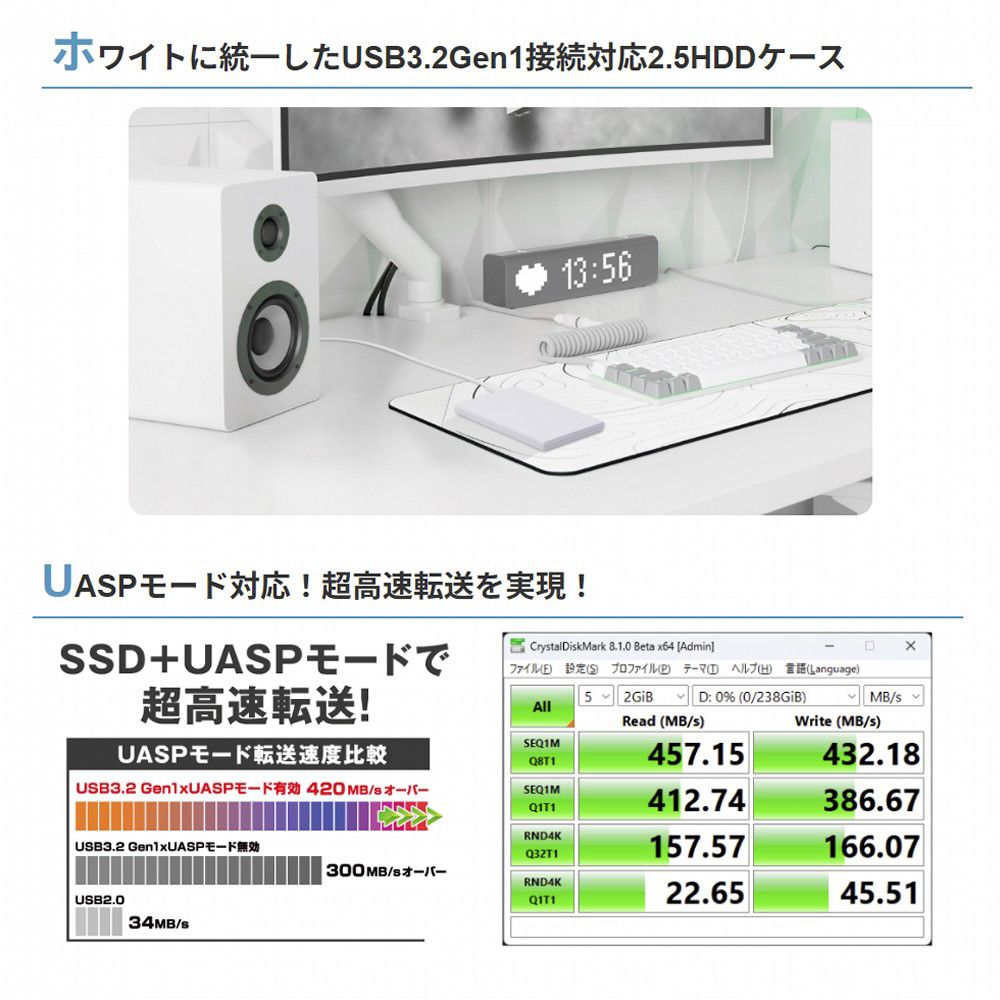 本体、ケーブルをホワイトに統一した2.5インチHDD/SSD用外付けケース。