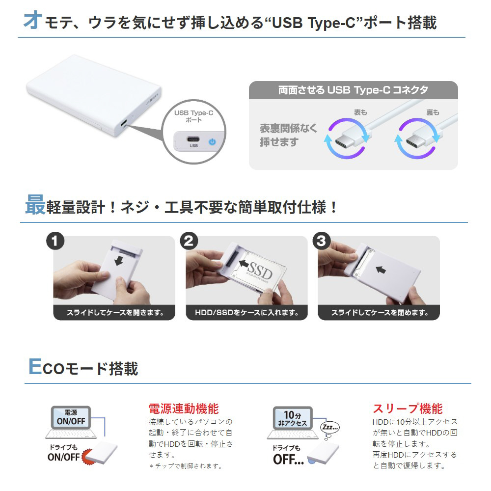 USB3.2gen1対応、7mm→9.5mm厚変更スペーサー付属、工具不要の簡単組立。