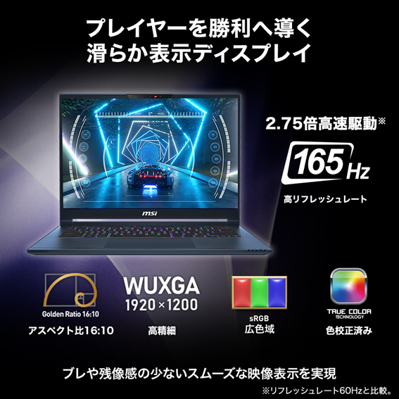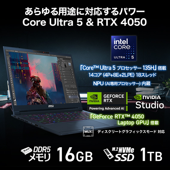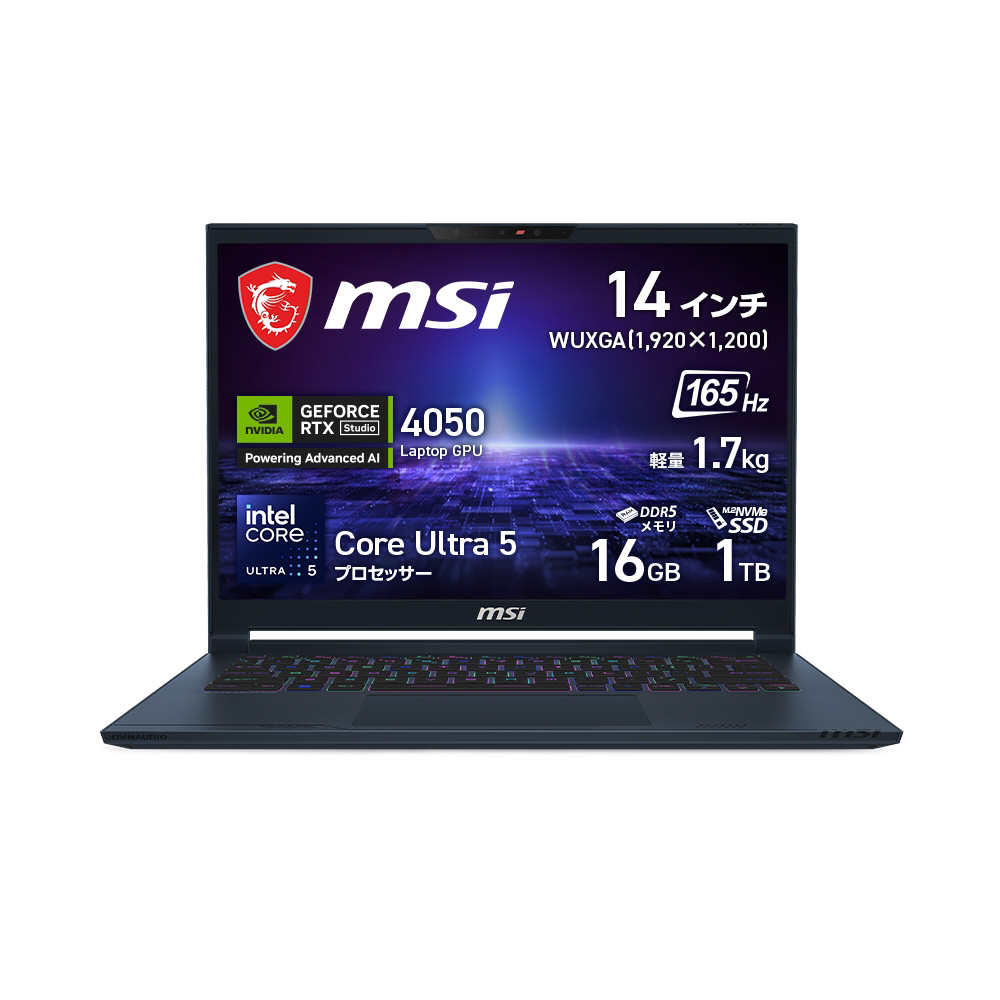 「Stealth 14 AI Studio A1V」は、薄さ21.8mm・軽さ1.7kgの14インチタイプの本体に「GeForce RTX 4050 Laptop GPU」を搭載した薄型・軽量・ハイエンドゲーミングノートPCです。