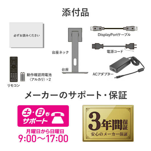 | 付属品 | 電源コード(PSE適合品)、DisplayPortケーブル、ACアダプター、台座ネック、台座、リモコン、動作確認用電池(アルカリ)×2、必ずお読みください |