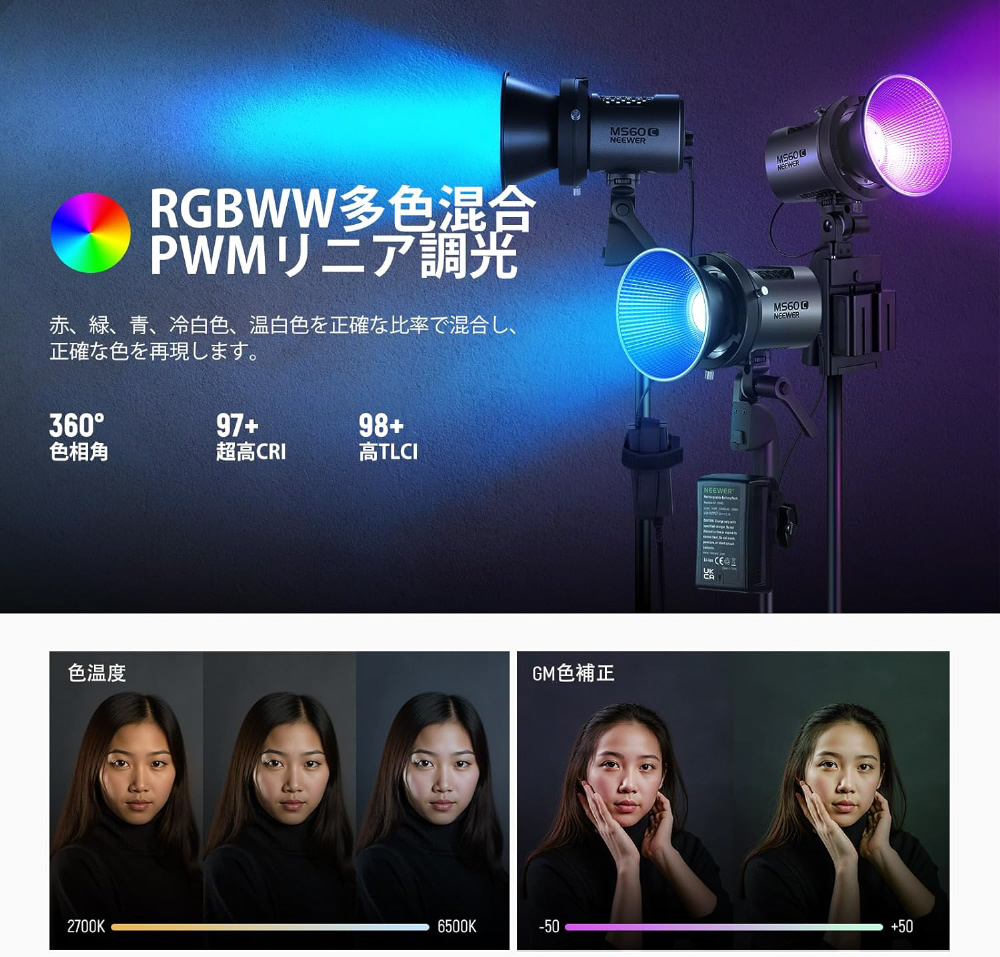 優れた演色性を実現.2..7.00K-6.5.00Kの広域色温度調整でき、6.5.W高出力で最大4.1.000lux/0.5.m(リフレクター使用時)の高照度を発揮します。また、CRI9.7.+/TLCI9.8.+のプロの色再現と1./2..000秒シャッター速度でもちらつきがありません。撮影用手持ちライトはPWM調光技術を採用し、1.%-1.00%精密調光が可能で、動画撮影、ポートレート撮影、などに最適です。