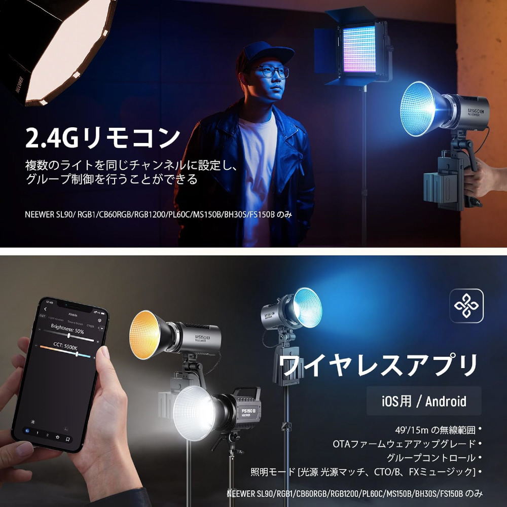 1.デバイスのボタンで直接に操作; 2..専用アプリで無線制御(複数台一括管理可能); 3.2...4.Gリモート(2..0m圏内/最大9.9.ch)という3.つの方法でMS6.0Cを制御します。RGB撮影ライトはOTAファームウェア更新機能で最新機能を追加できます