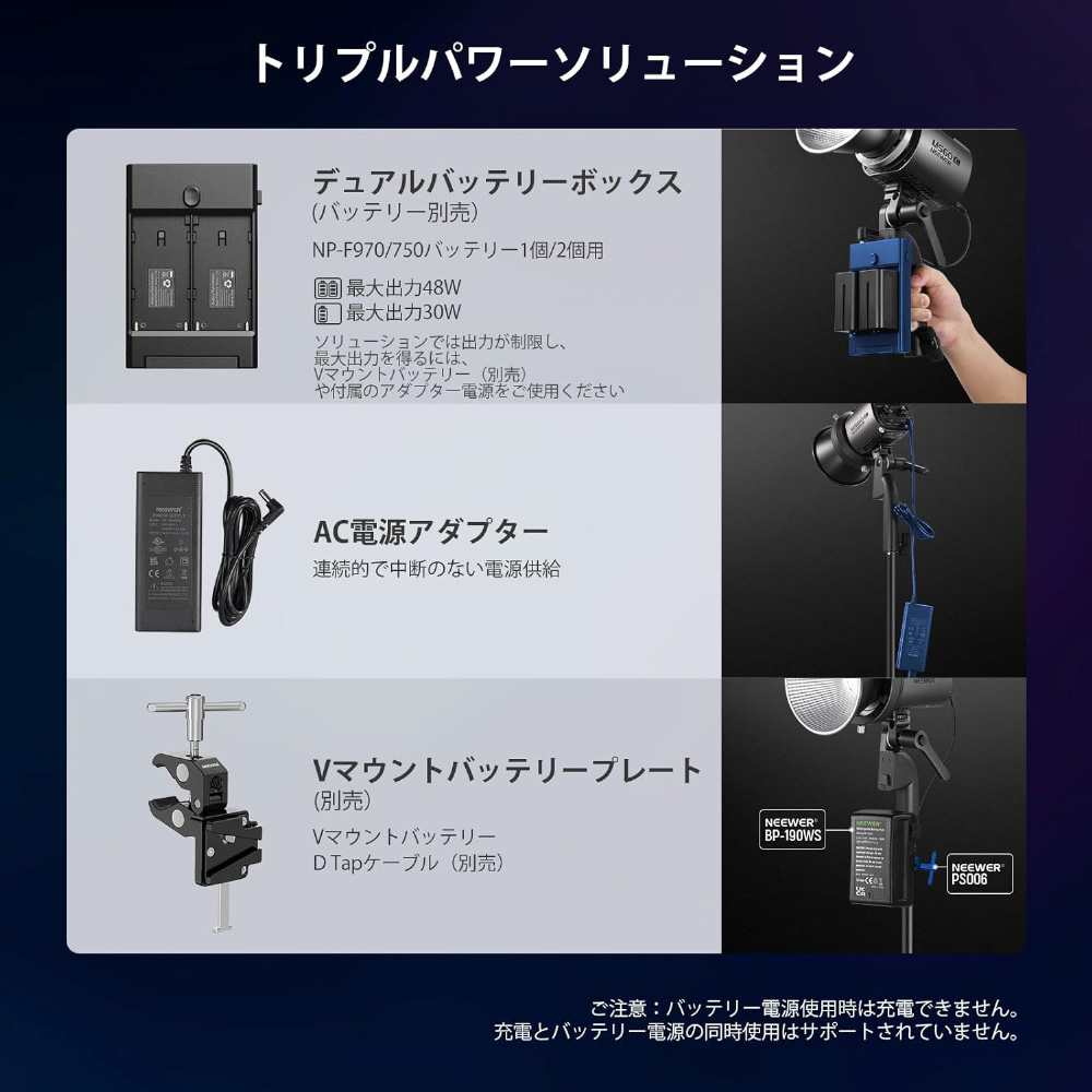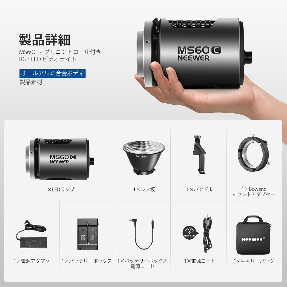 ■セット内容&安心保証 1.x MS6.0C LEDビデオライト、1.x リフレクター、1.x ハンドル、1.x 電源ケーブル(JPプラグ)、1.x 電源アダプタ、1.x バッテリープレート、1.x バッテリーケーブル、1.x Vマウントバッテリーアダプタープレート。日本語取扱説明書も同梱