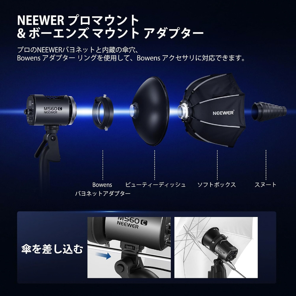 金属アルミ製ボディを備え、重量わずか7.00g サイズは1.5.0x9.5.x9.2..mmです。超小型デザインで屋外ロケ、にも最適です。1.8.0°調整可能な取り外しハンドルとBowensマウント対応を装備し、ストリーミング照明からスタジオ照明まで多用途に活用できます。静音ファンは超低騒音で、長時間連続使用可能です