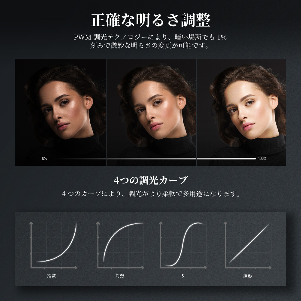 明るさレベル 0 〜 1.00% まで 1.% 刻みで正確に調整可能。4. つの調光パターン (指数関数、対数、S、線形) より、正確な照明調整に。高い CRI 9.7.+ および TLCI 9.8.+ は忠実な演色性を保証します。2..7.00K〜6.5.00K の広大な色温度範囲により、温かみのある照明と冷感照明を提供し、1.2..種類の特殊効果でビデオ 独特な制作を可能にします