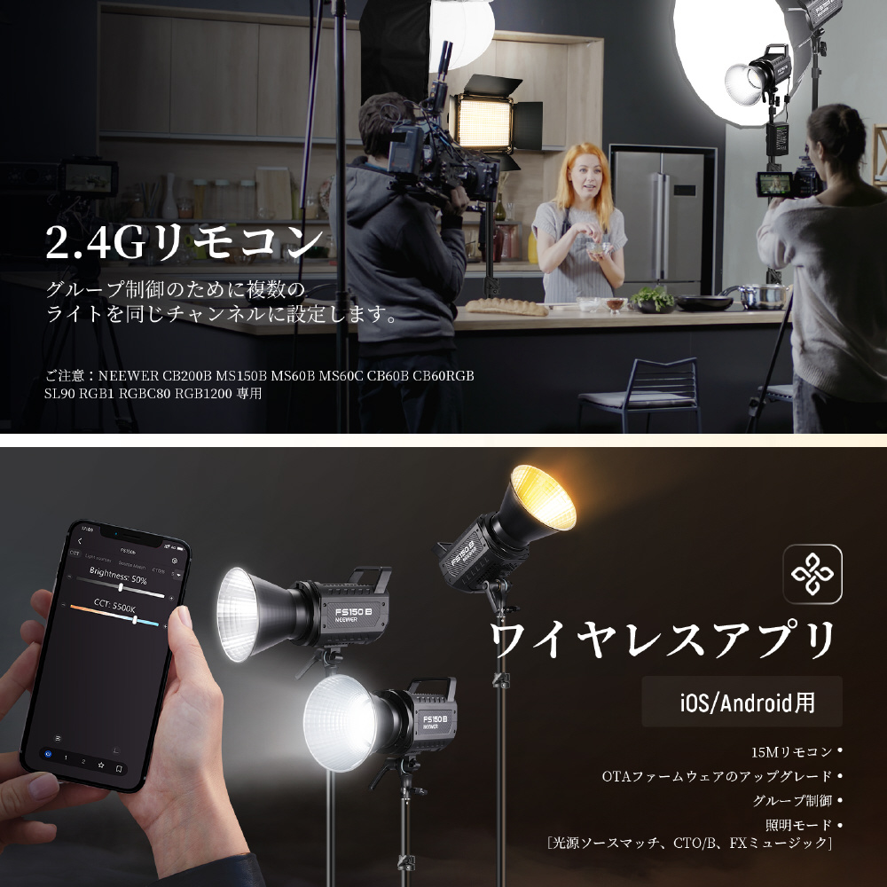 NEEWERN APP でグループ制御と OTA ファームウェアアップデートをサポート、光源、ソースマッチ、CTO/B、FX ミュージックなどの高度な照明制御機能も提供します。内蔵 2...4.G システムは、4.9.ft (1.5.m)以内の00〜 9.9. チャンネルで、さまざまなモデル (SL9.0、RGB1.、RGB C8.0、RGB 1.2..00、MS6.0C、MC6.0B、MS1.5.0B、)のグループ制御をサポートします。すべてのライトが同じチャンネルに設定されている場合、1.つのライトを設定すると他のライトも同時に変更できます。