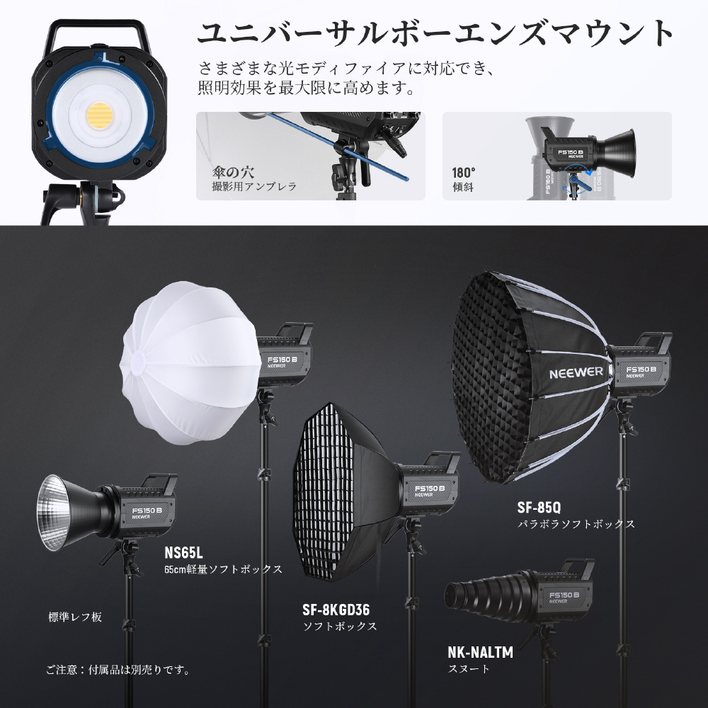 付属のレフ板は内側に目盛り模様があり、光源を均一に分配し、Bowensマウントはソフトボックス、スヌート、ビューティーディッシュ、その他のライト形状に対応します。傘ソケットにより撮影用傘とレフ板の取り付けが一度に可能です。静音冷却ファンを備えたアルミニウム合金シェルは、実際の動作温度に基づいて熱を自動的に低減し、過熱保護と静穏撮影環境を実現