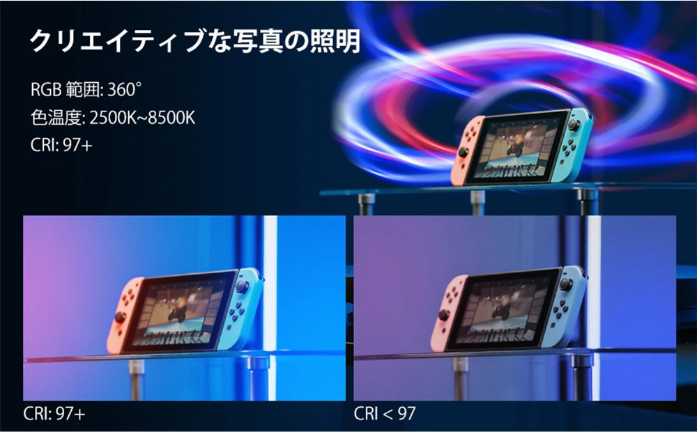長さ1.0.8.cm。幅4.cm 重さわずか1.3.4.g 最大出力 6.W、9.7. CRI、1.2..0° の照明角度、8.00 ルクス/0.5.m の照明を備えた 9.6. 個の高性能 LED ランプ ビーズ。 LCDディスプレイを使用してライト設定を明確に読み取り。被写体の2..m以内の距離がベストな設置です