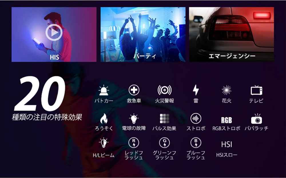 コンパクトサイズのLEDライトでありながら、バイカラーCCTモード、カラーHSIモード、FXシーンの3.つのモードで設計されています。 CCT モードで色温度を 2..5.00K (暖色) から 8.5.00K (冷色) に簡単に変更できます。 HSI モードでは、光の色合いを 0° から 3.6.0° の範囲で調整します。 FX シーンは、2..0 の特殊な照明効果 (稲妻、パーティー、花火などを含む) を提供します。明るさは 3. つのモードすべてで 0% から 1.00% まで調整可能です。