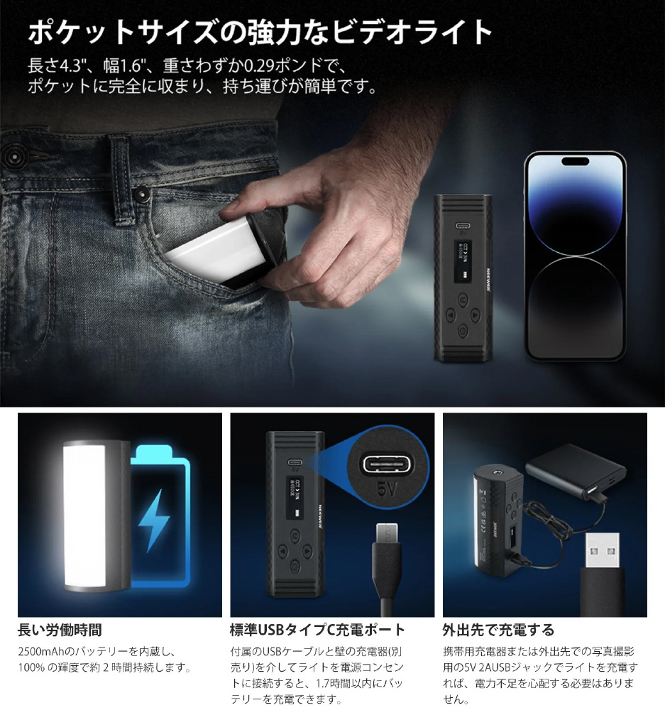 RGBライトには2..5.00mAhの充電式リチウムバッテリーが内蔵されており、完全に充電すると最大2..時間、1.00%の明るさでライトに電力を供給できます。 背面に USB Type-C 充電ポートがあり、付属の USB ケーブルと壁の充電器 (別売り) を介してライトを電源コンセントに接続すると、1..7. 時間でバッテリーを完全に充電できます。 または、ポータブル充電器または 5.V 2..A USB ジャックで充電して、外出先で撮影することもできます。
