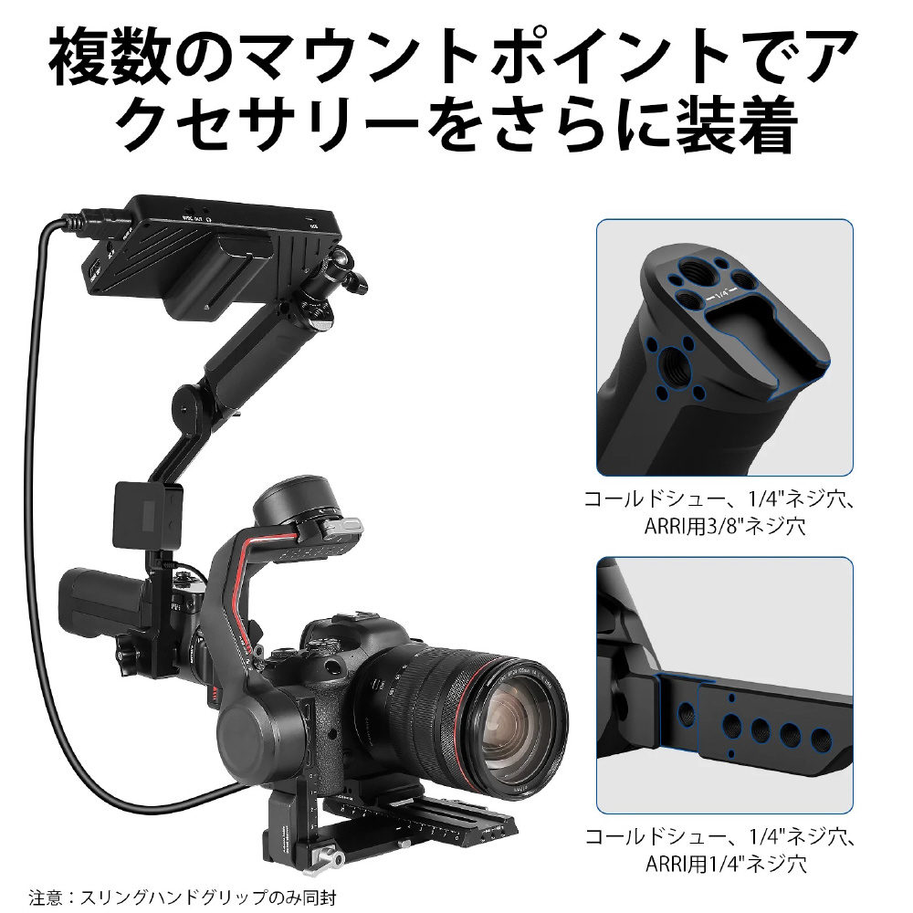 スリンググリップには、複数の1./4.と3./8.ネジ穴、ARRIピンに対応できる位置決め穴、2.. つのコールド シュー アダプターが備えており、LEDライト、サウンドレシーバー、モニターなどさまざまなアクセサリーを取り付けることができます。