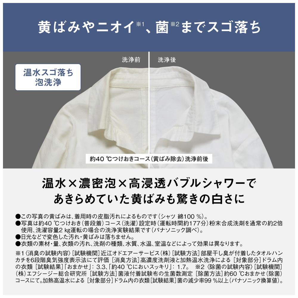 ※2〈消臭の試験内容〉[試験機関]近江オドエアーサービス(株)[試験方法]部屋干し臭が付着したタオルハンカチを6段階臭気強度表示法にて評価[消臭方法]約40℃においスッキリコースにて。高濃度洗剤液と加熱温水洗浄による[対象部分]ドラム内の衣類[試験結果]「おまかせ」: 3.3、「約40℃においスッキリ」: 1.7