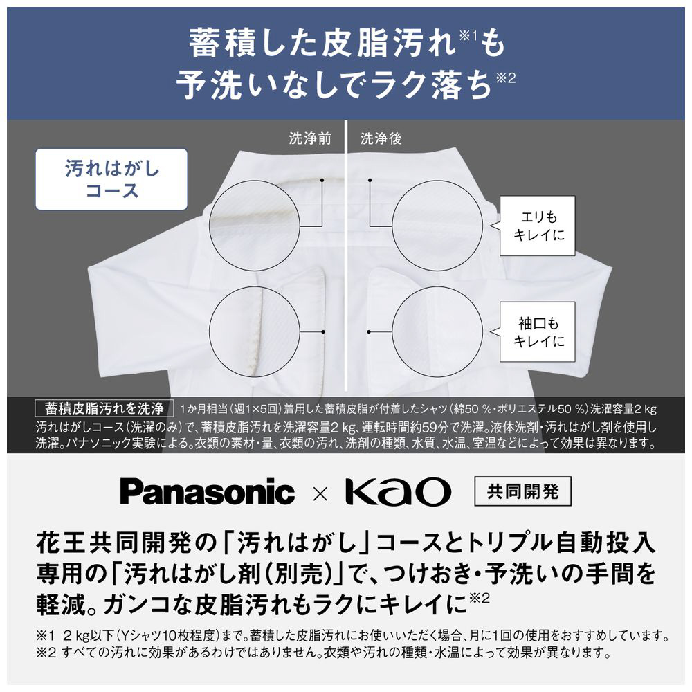 ※1 洗濯〜乾燥おまかせコース・定格洗濯乾燥6kg時。パナソニック2024年度モデルNA-LX129D(約890Wh)とNA-LX129E(約800Wh)の消費電力量比較。衣類の素材・入れ方・洗濯時の状況により、運転時間・消費電力量は前後します。