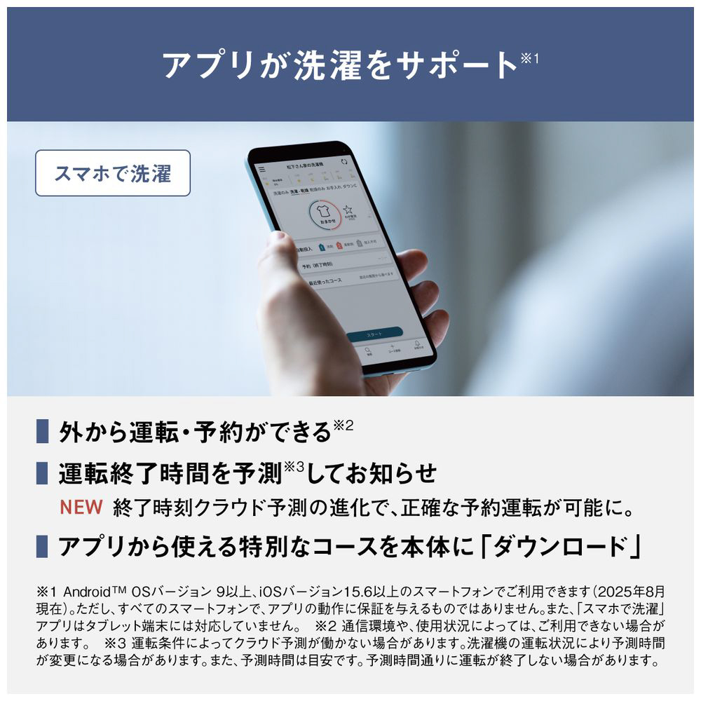※6 AndroidTM OSバージョン 9以上、iOSバージョン15.6以上のスマートフォンでご利用できます(2025年8月19日現在)。ただし、すべてのスマートフォンで、アプリの動作に保証を与えるものではありません。また、「スマホで洗濯」アプリはタブレット端末には対応していません。