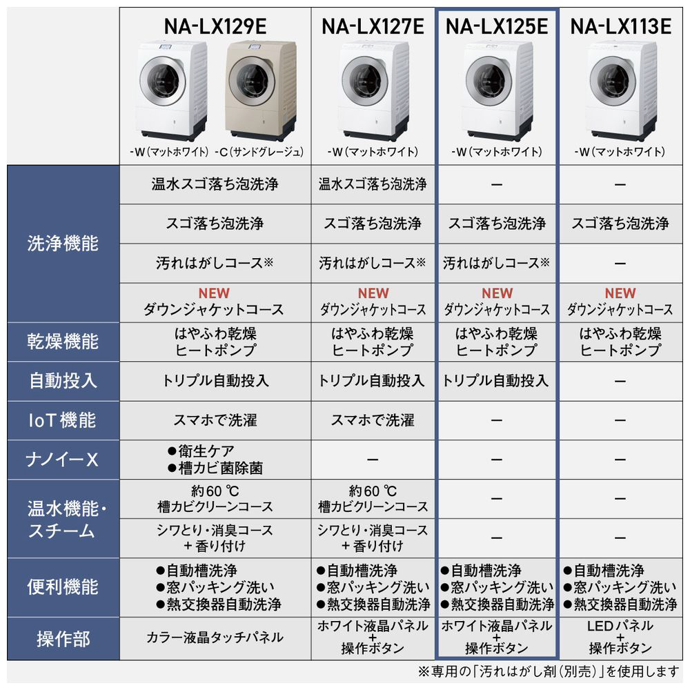 | 商品名 | ドラム式洗濯乾燥機 LXシリーズ マットホワイト NA-LX125EL-W [洗濯12.0kg /乾燥6.0kg /ヒートポンプ乾燥 /左開き] |