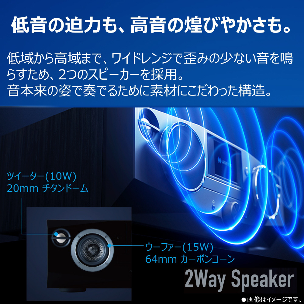 低域から高域まで、ワイドレンジで歪みの少ない音を鳴らすため、ツイーター(10W)には20mmチタンドーム、ウーファー(15W)には64mmカーボンコーンを採用。