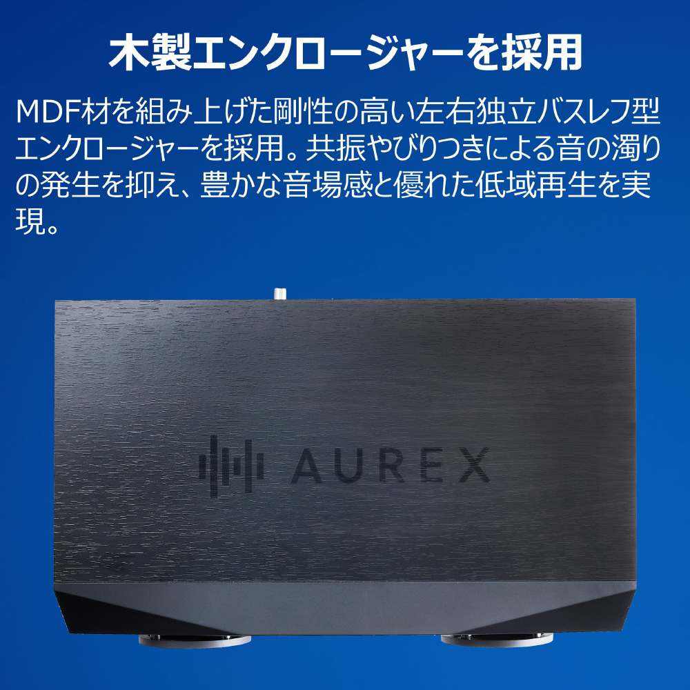 「音の忠実再現」を追求し、独自開発したDSP「オーレックス・サウンドプロセッサー」を搭載。高品質の2Wayスピーカーを搭載したAUREXのワイヤレススピーカーシステム。