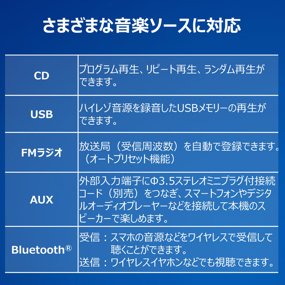 【CD/USB/FMラジオ/AUX/BluetoothRに対応】