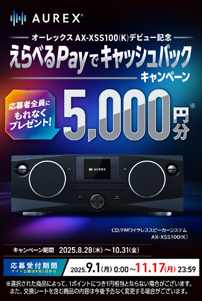 | 商品名 | コンポ AUREX ブラック AX-XSS100(K) [Bluetooth対応 /ハイレゾ対応 /ワイドFM対応] |