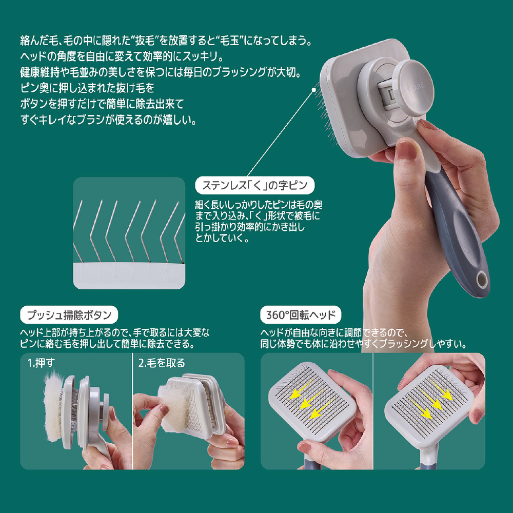 回転ヘッドで抜け毛・もつれを取り除く掃除ボタンでピンの毛を除去
