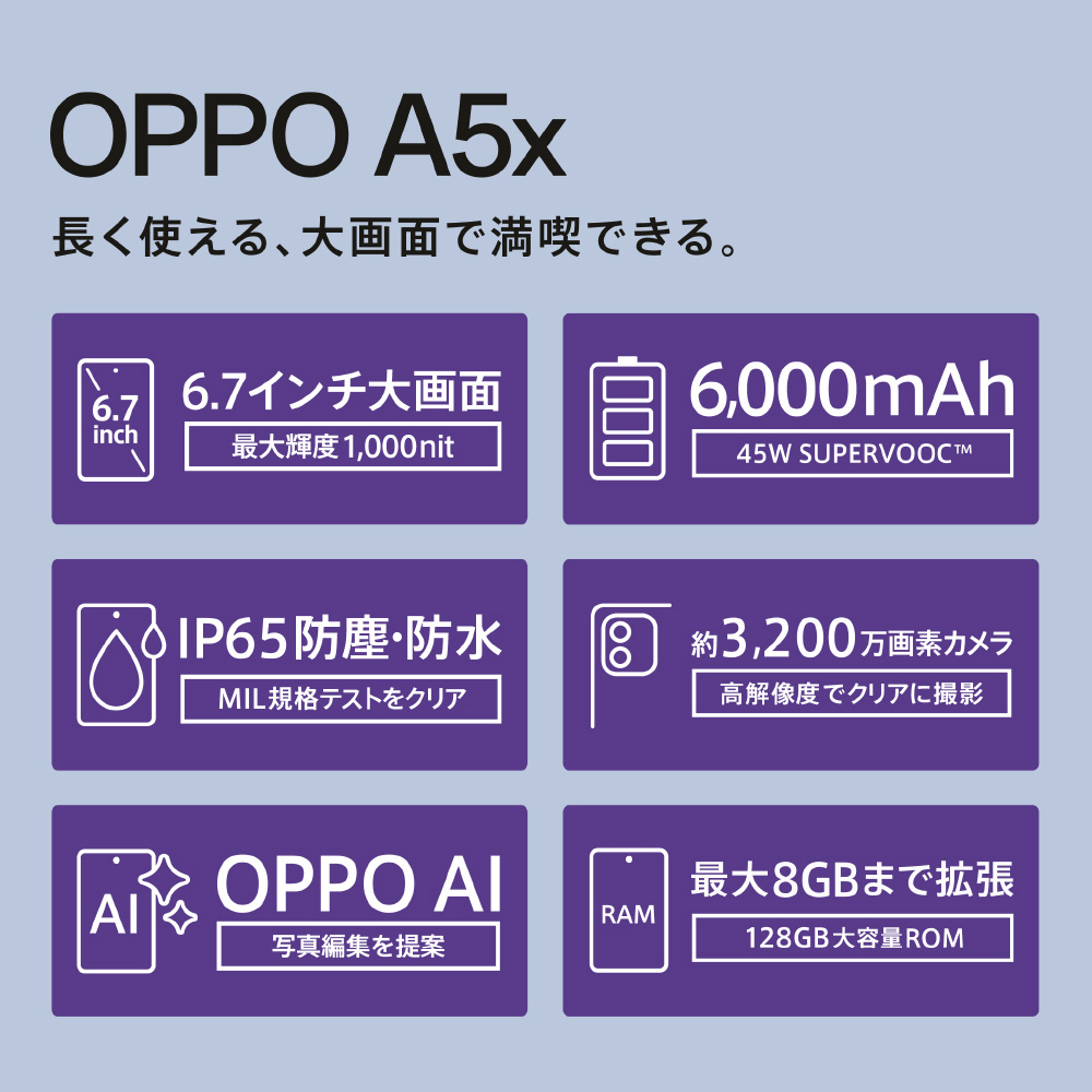 【SIMフリー】OPPO A5x 「CPH2725 BL」Snapdragon 6s 4G Gen 1 6.7インチ・メモリ/ストレージ:4GB/128GB nanoSIM ×2 +microSD【防水・防塵】 ブルー