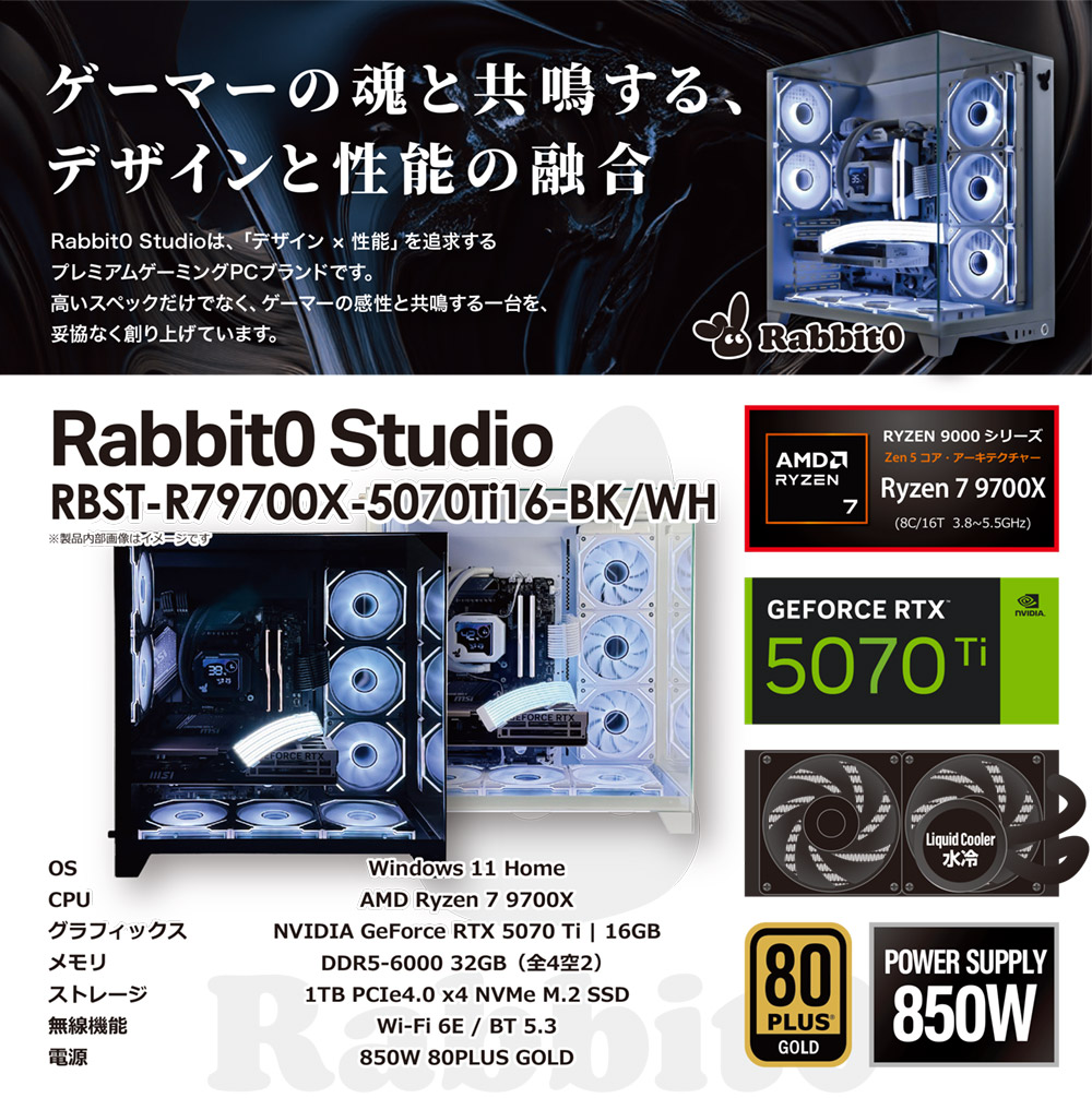 ゲーミングデスクトップパソコン Rabbit0 Studio RBST-R79700X-5070Ti16-BW ブラックモデル [RTX5070Ti]